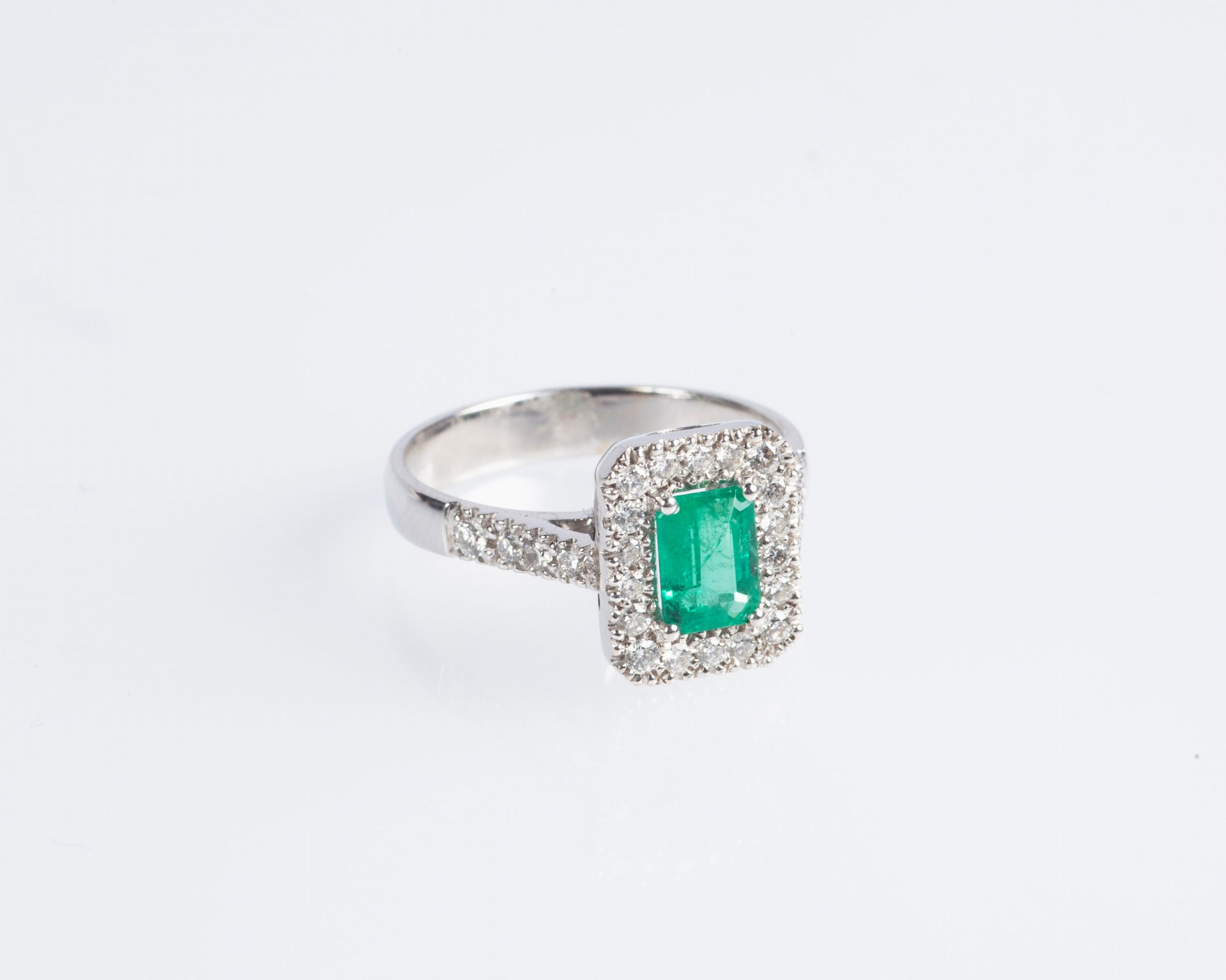 Oro bianco 750/000. Smeraldo naturale in taglio smeraldo ct 1,30 ca. , diamanti in taglio rotondo brillante ct, 0,30. Peso complessivo gr.5,30.