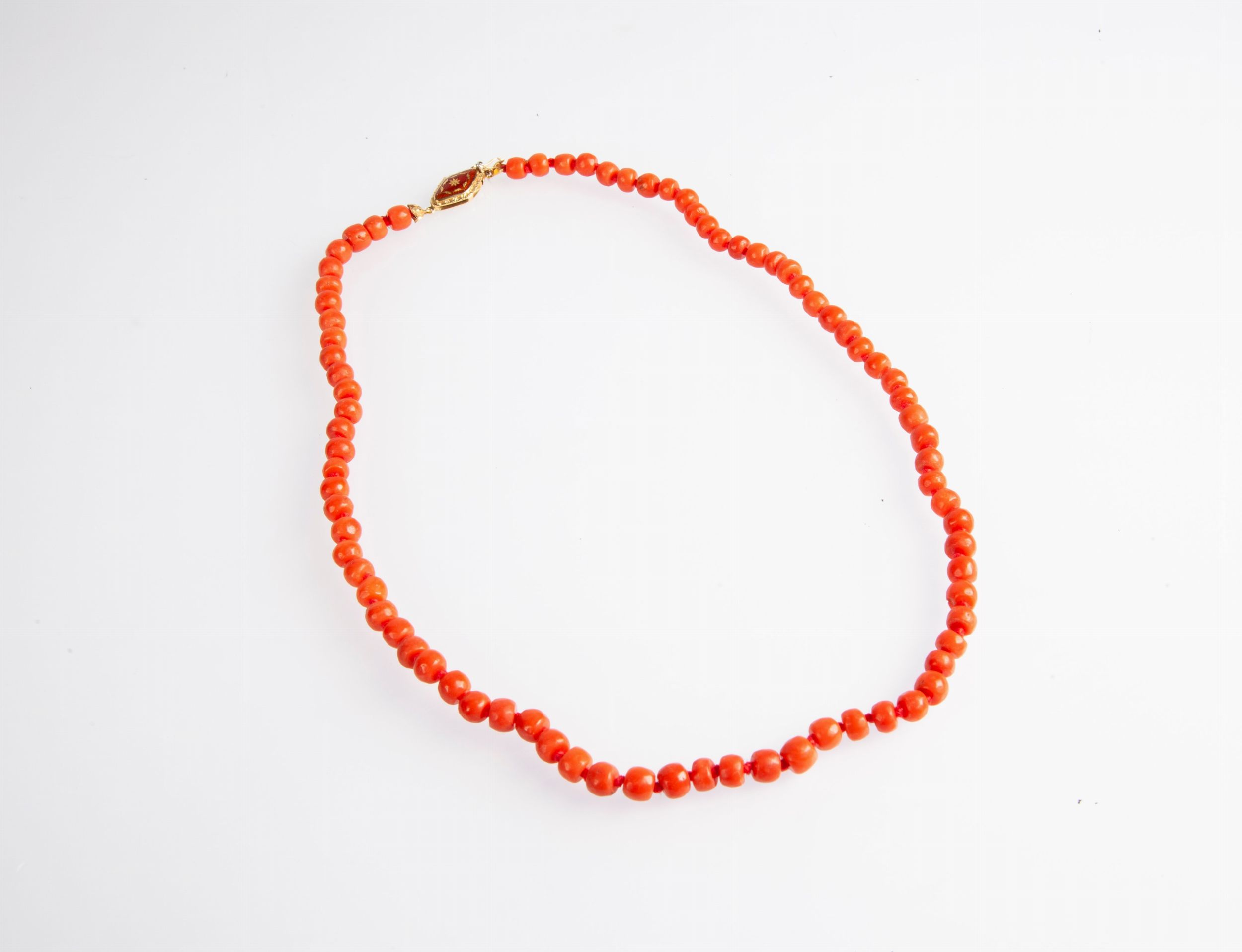 Oro giallo 750/000. Corallo rosso in taglio barilotto liscio ,diametro mm. 7. Peso complessivo gr. 34,40.