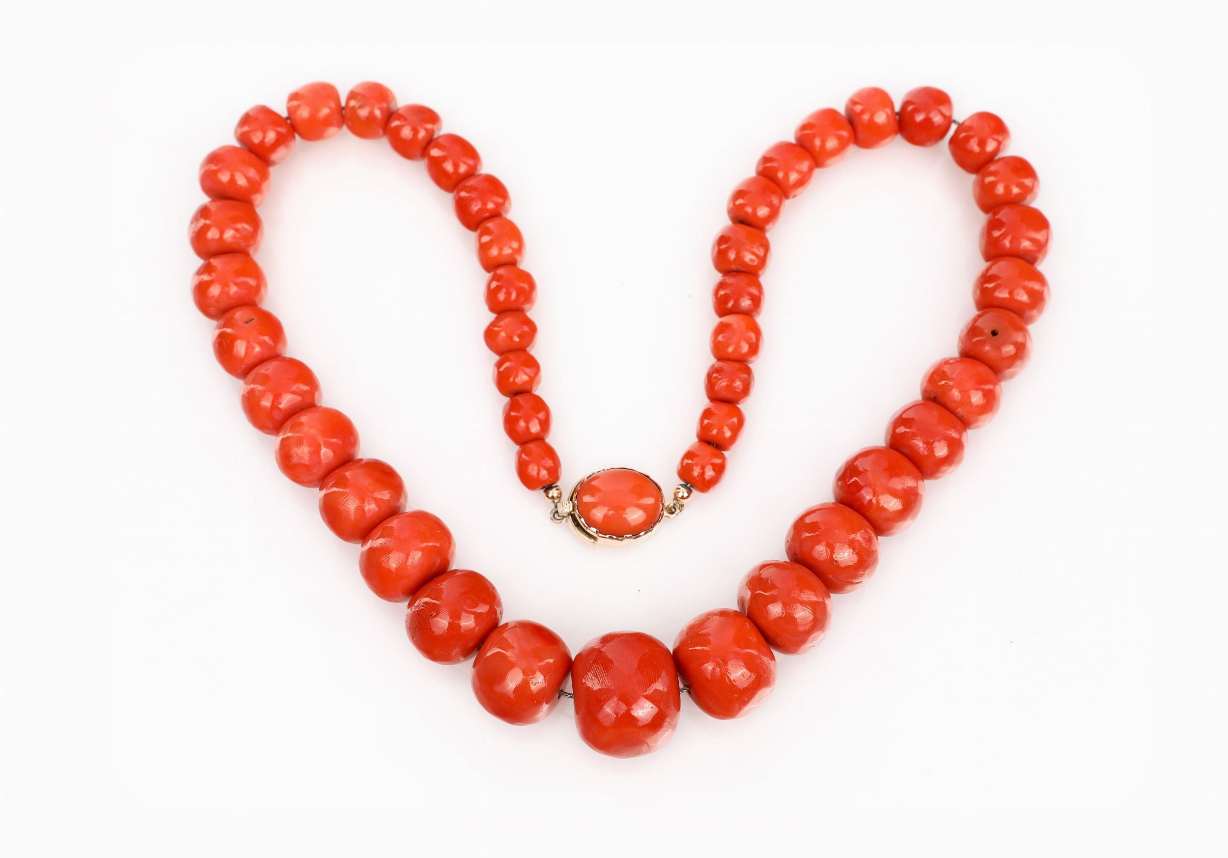 Oro giallo a basso titolo. Corallo in taglio semisferico , da mm 7 a mm 19. Peso complessivo gr. 115.