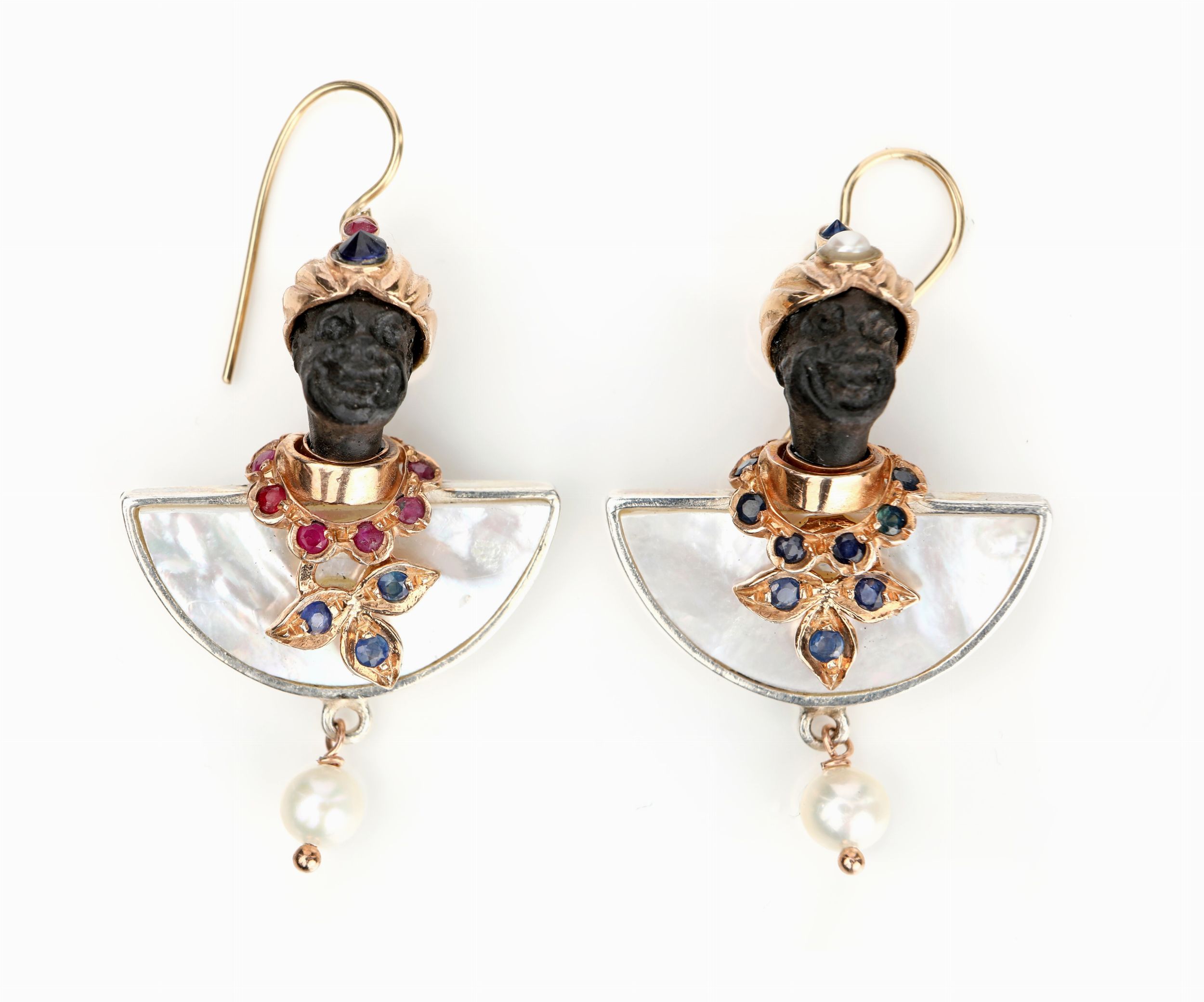 Coppia di orecchini moretto in oro madreperla , argento, rubini e zaffiri