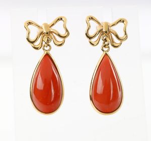 cm 3,5 Oro giallo 750/000, corallo in taglio goccia. Peso complessivo gr. 8,60