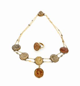 Lunghezza cm 42, anello misura 16 Oro giallo basso titolo, camei in pietra lavica.