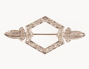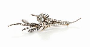 Lunghezza cm 13 Spilla dell'inizio del XIX secolo. Oro a basso titolo, argento , diamanti in taglio old mine. [..]