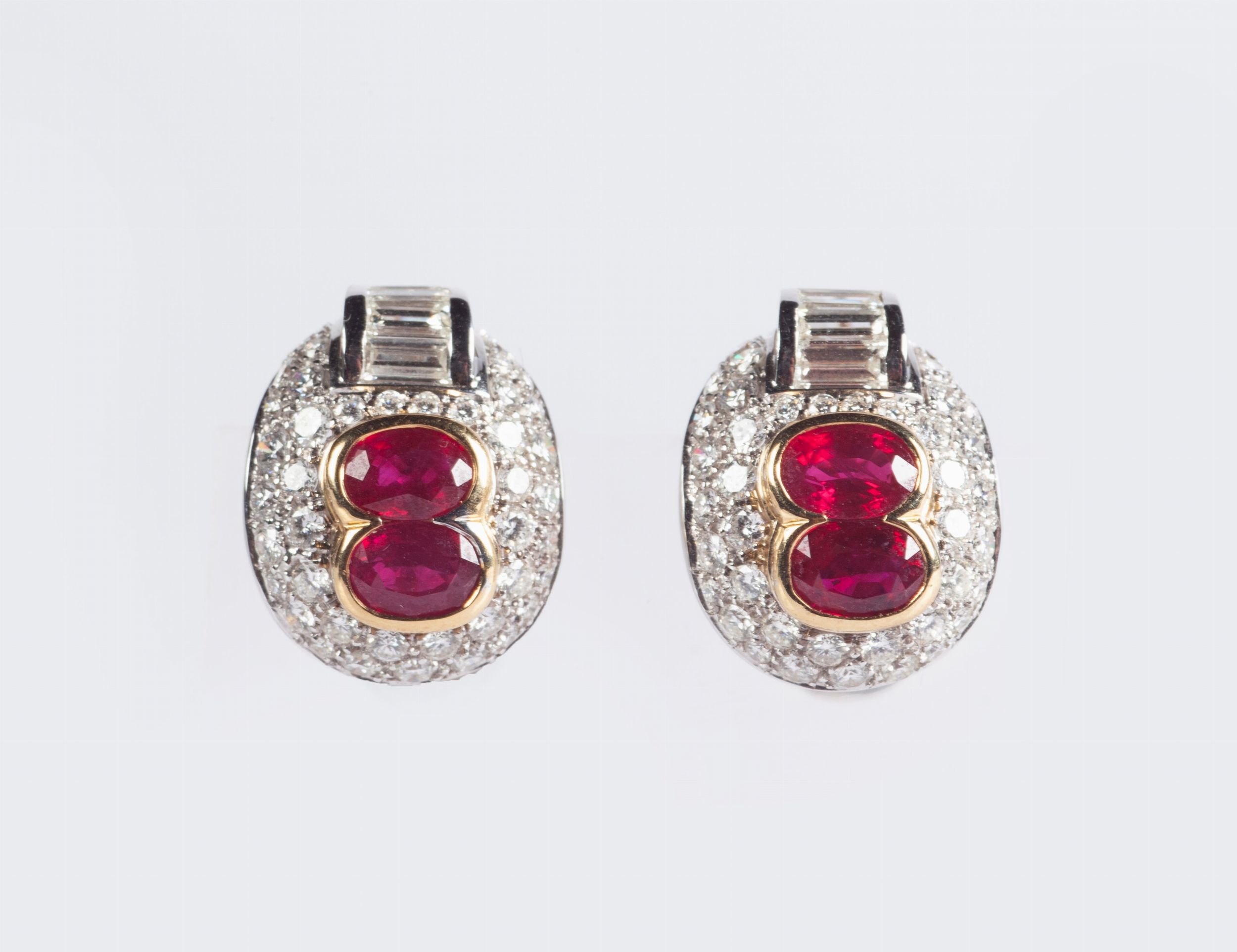 Oro bianco e giallo 750/000. Diamanti taglio rotondo brillante e taglio baguettes F-G, IF VVS1 ct. 2,80 ca. Quattro rubini in taglio ovale ct. 3 ca. Peso complessivo gr. 11,20.