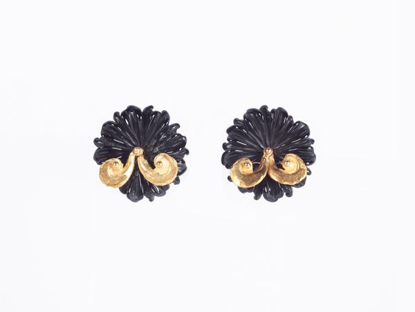 Oro giallo 750/000, onice tagliato a motivo floreale. Peso complessivo gr. 6,70.
