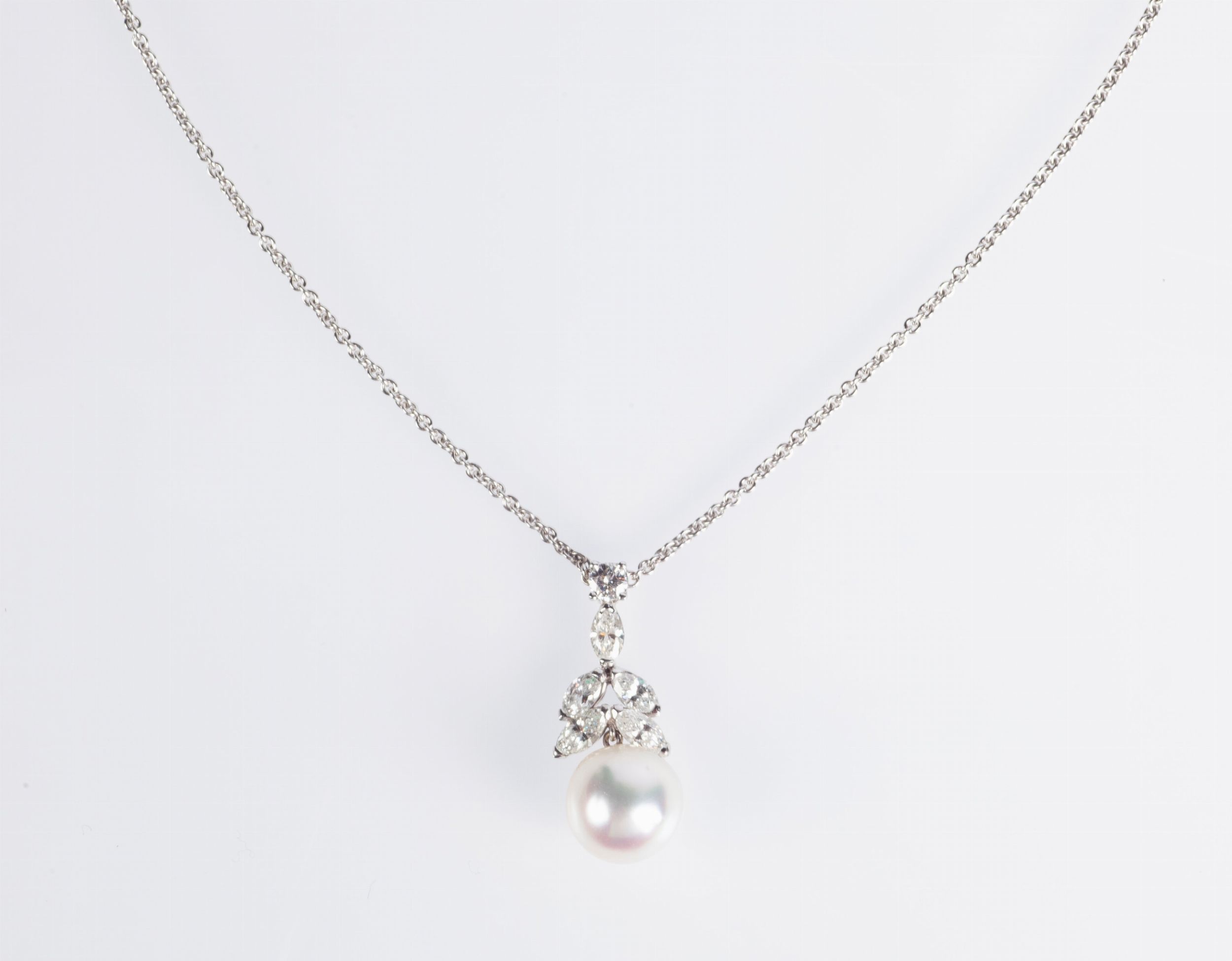 Oro bianco 750/000. Diamanti taglio rotondo e navette ct. 1,30 FG VVS VS, perla mm 10. Peso complessivo gr. 7,3.