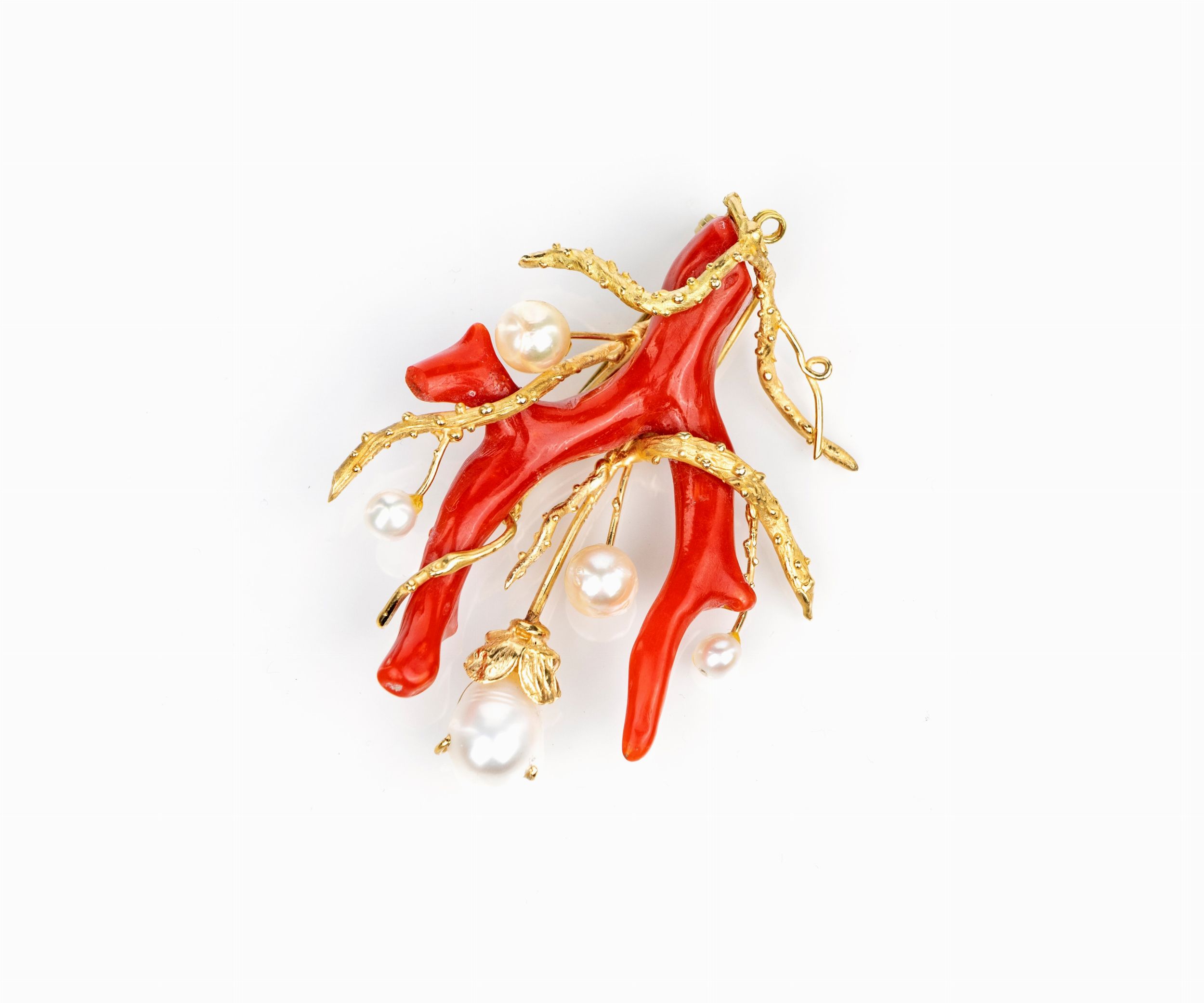 Oro giallo 750/000, corallo rosso e perle freshwater. Peso complessivo gr. 21,5.