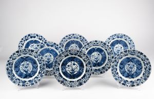 Otto piatti in porcellana bianca e blu. Cina, secolo XVIII