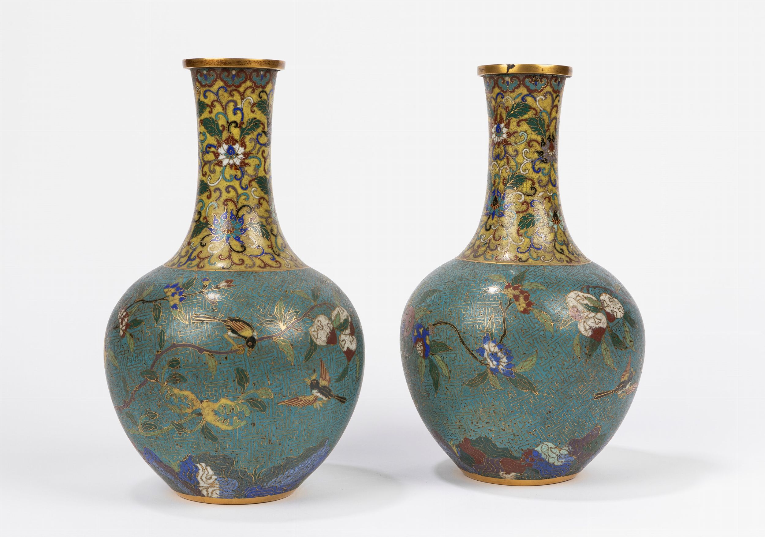 Coppia di vasi a bottiglia in smalto cloisonné. Cina, secolo XIX
