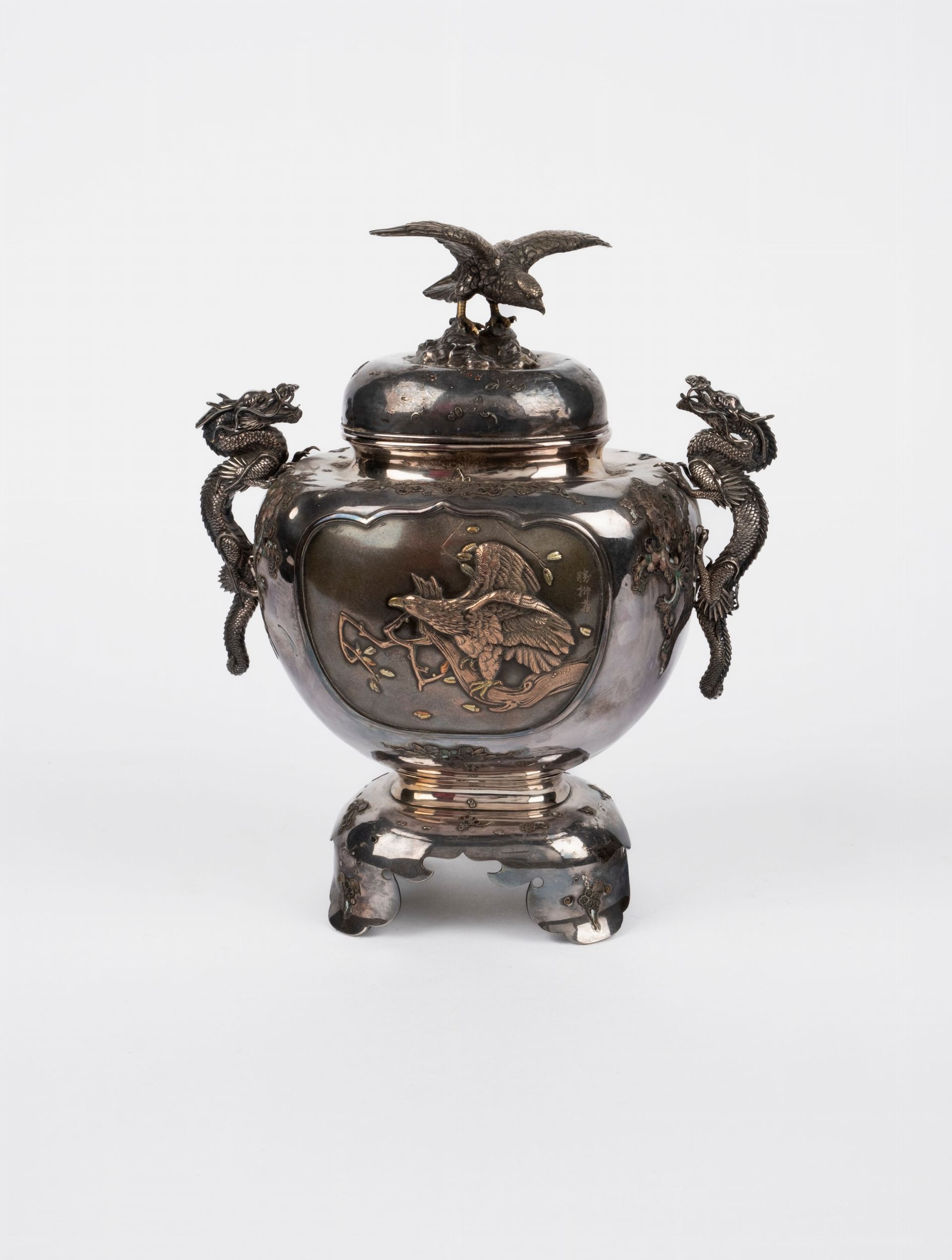 finemente cesellato e sbalzato, decorato a riserve con rapaci e oche, con smalti, anse a guisa di drago e presa del coperchio sormontato da aquila, firmato