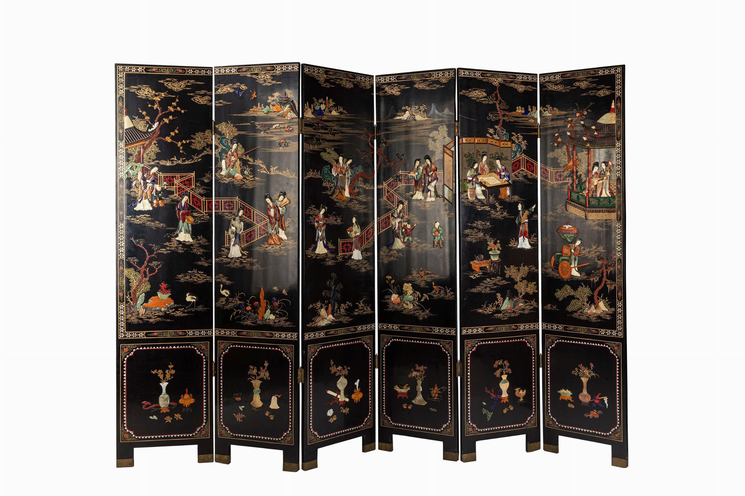 Paravento a sei ante in lacca nera e oro. Cina, secolo XX