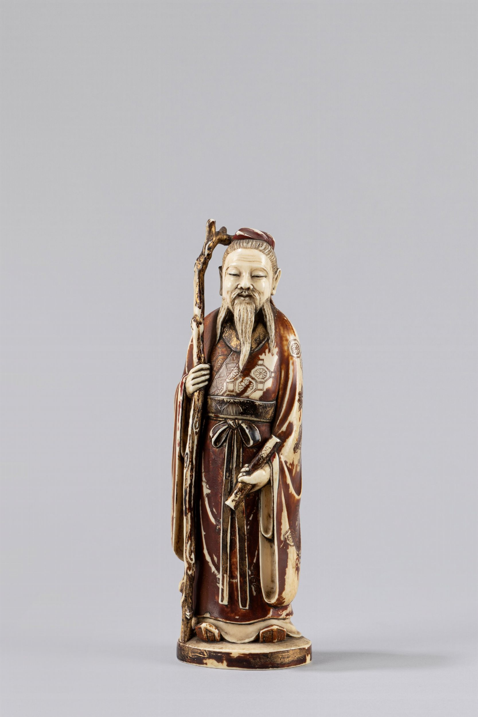 Scultura in avorio raffigurante saggio con bastone. Cina, secolo XIX