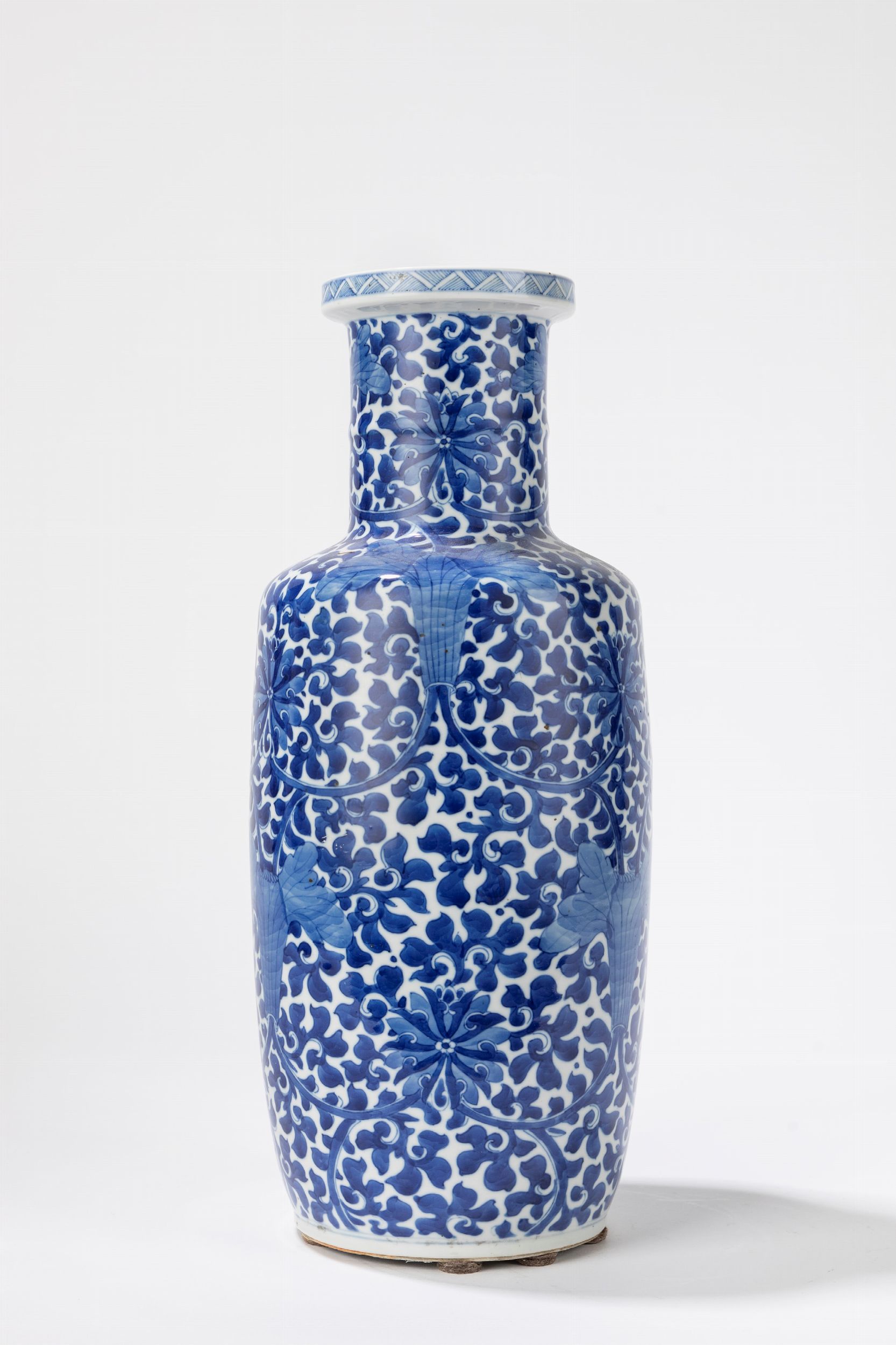 Vaso a rullo in porcellana bianca e blu. Cina, periodo Guangxu (1875-1908)