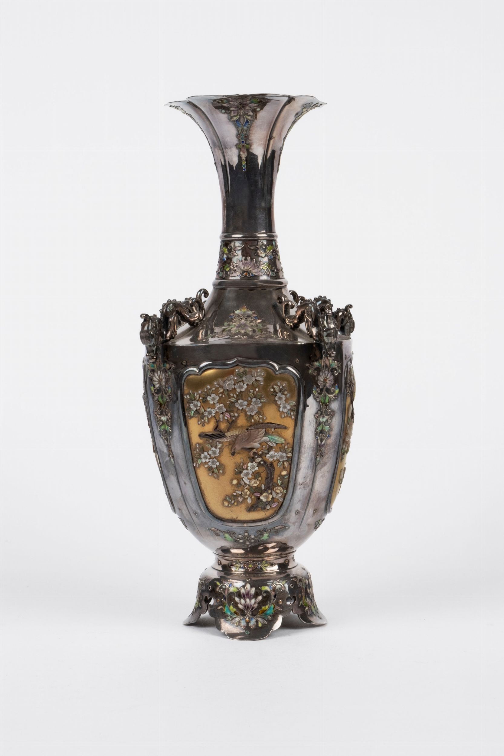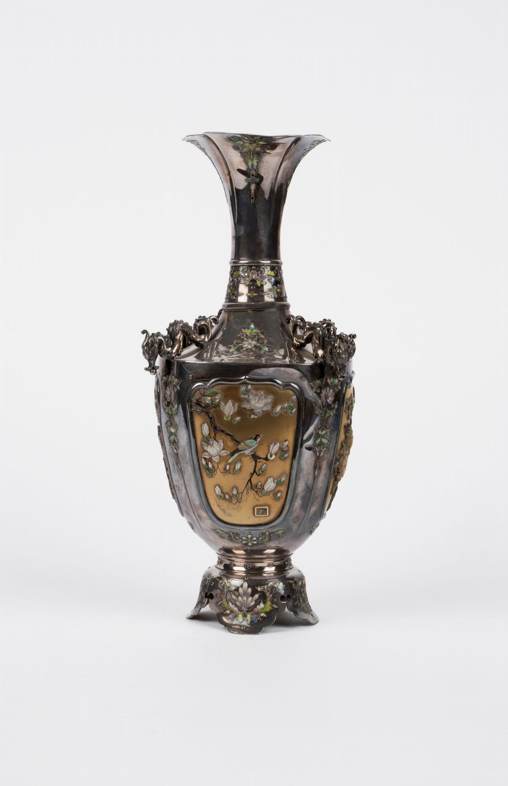 in argento con applicazioni in madreperla e smalto, decorato a riserve con uccellini e rami fioriti, firmato