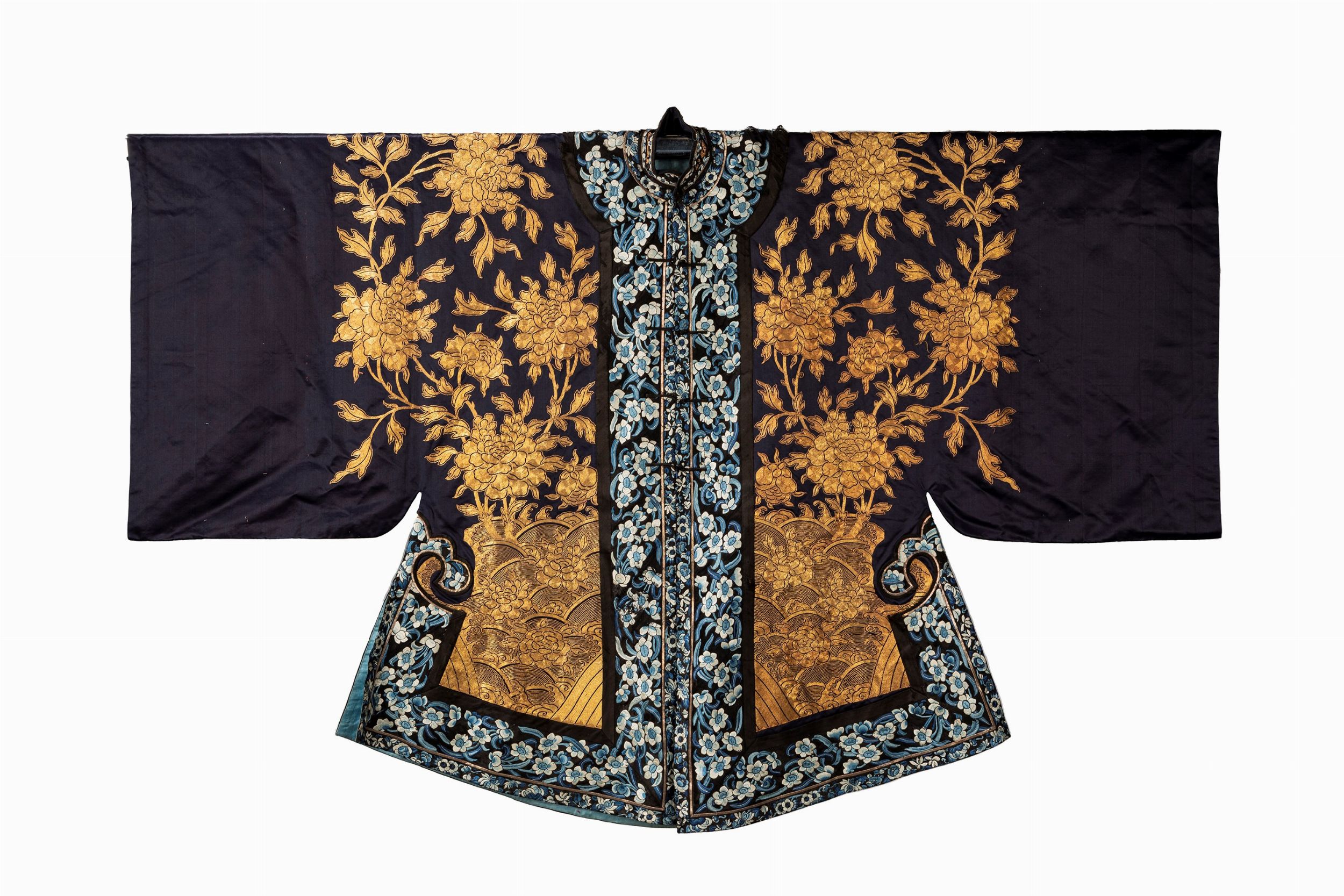 riccamente ricamata con fili dorati a motivi di peonie e nuvole