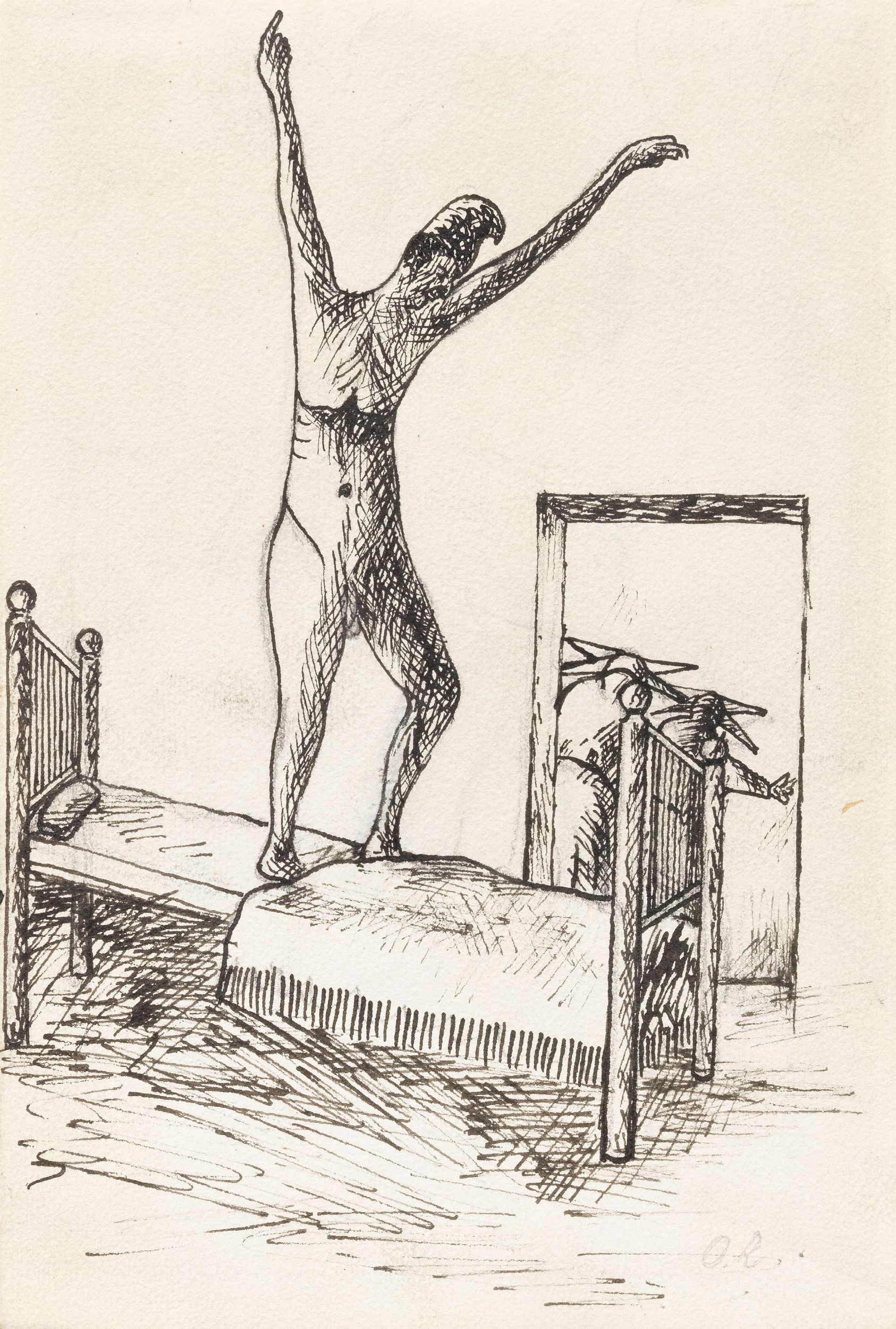 Inchiostro e matita su carta, cm. 22x14,6 (1929) Sigla in basso a destra: O.R.; scritta al verso: E mi rizzai sul / letto ecc. / Illustrazione del / racconto di guerra di / Otto Rosai / Il Ribelle.