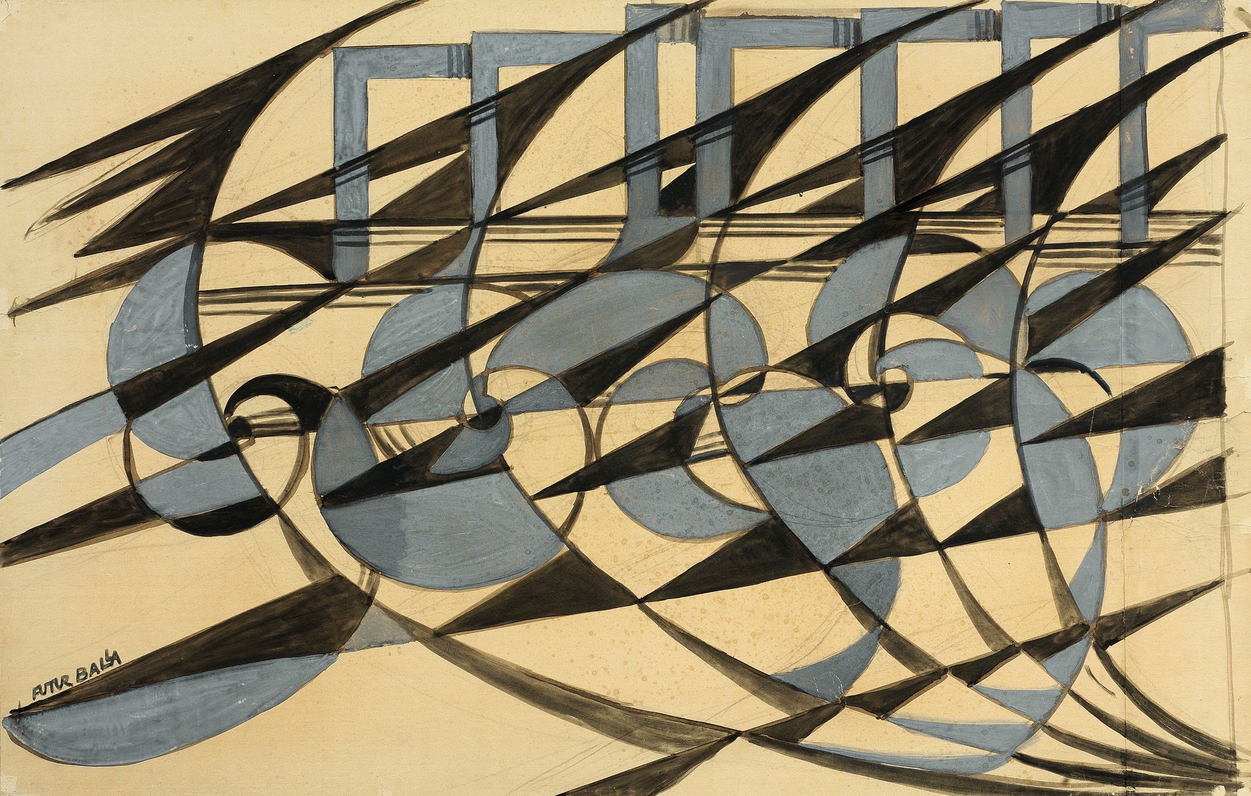 Tempera su carta applicata su tela, cm. 77x119,5 1925 ca. Firma in basso a sinistra: Futur Balla. Al verso sul telaio: cartiglio Biennale di Venezia '78, con n. 182: cartiglio scritto a macchina: Giacomo Balla / Automobile in corsa / (disegno esecutivo per arazzo): etichetta di Casa Balla con n. 1094.