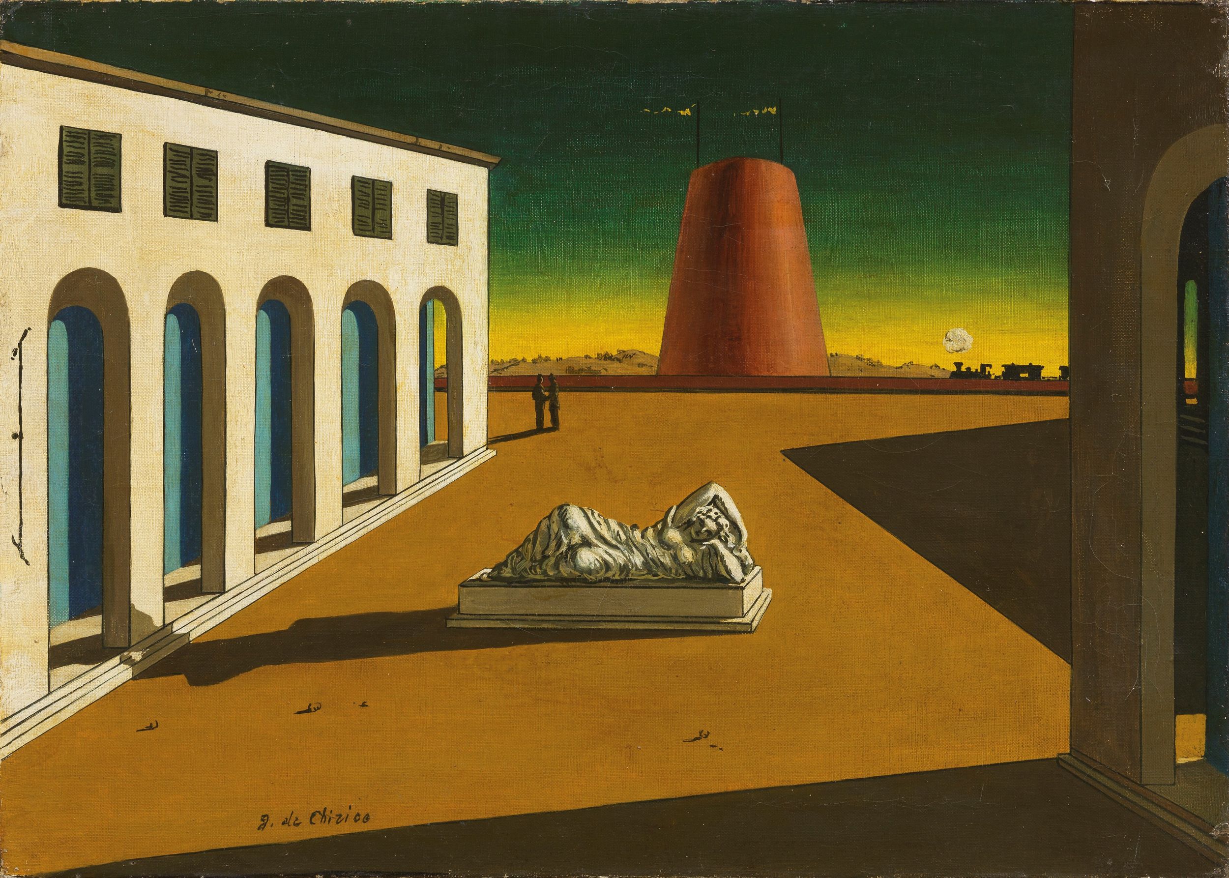 Olio su tela, cm. 50x70 1953 Firma in basso a sinistra: G. de Chirico; dichiarazione d'autenticità al verso sulla tela: questa piazza d'Italia / è opera autentica / da me eseguita e firmata / Giorgio de Chirico; sul telaio: etichetta Los Angeles County Museum of Art / Los Angeles, California, con n. L.2559.67-33 (con titolo «Piazza di Roma»).