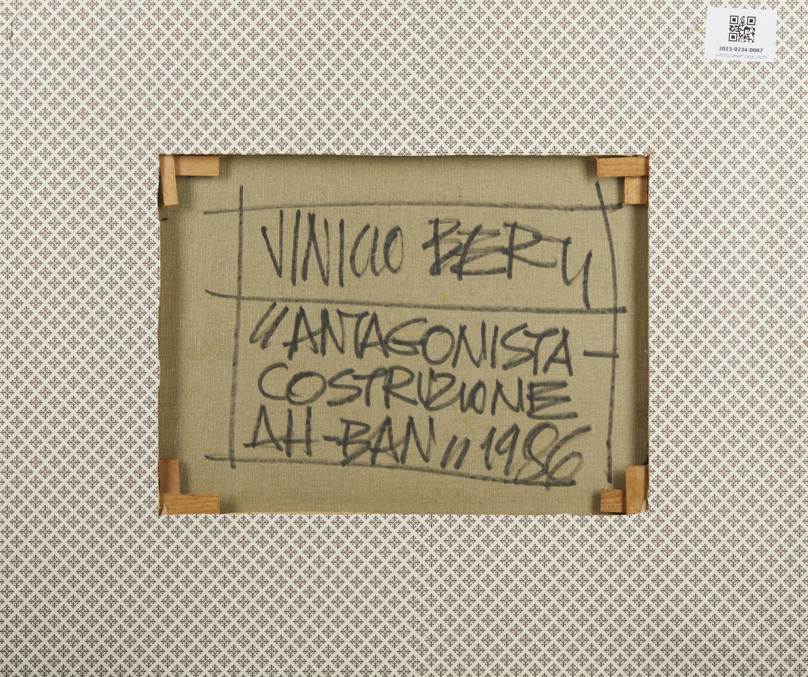 Firma e anno in basso a destra. Al retro titolo, firma e anno. Certificato d'autenticità rilasciato da Carlo Frittelli, Centro d'arte Spaziotempo, Firenze, come da documentazione fotografica allegata all'opera. Provenienza: Collezione privata, Padova.