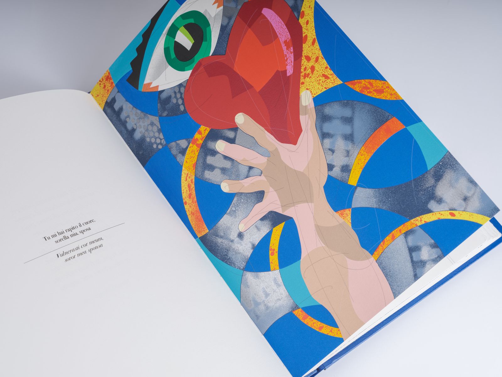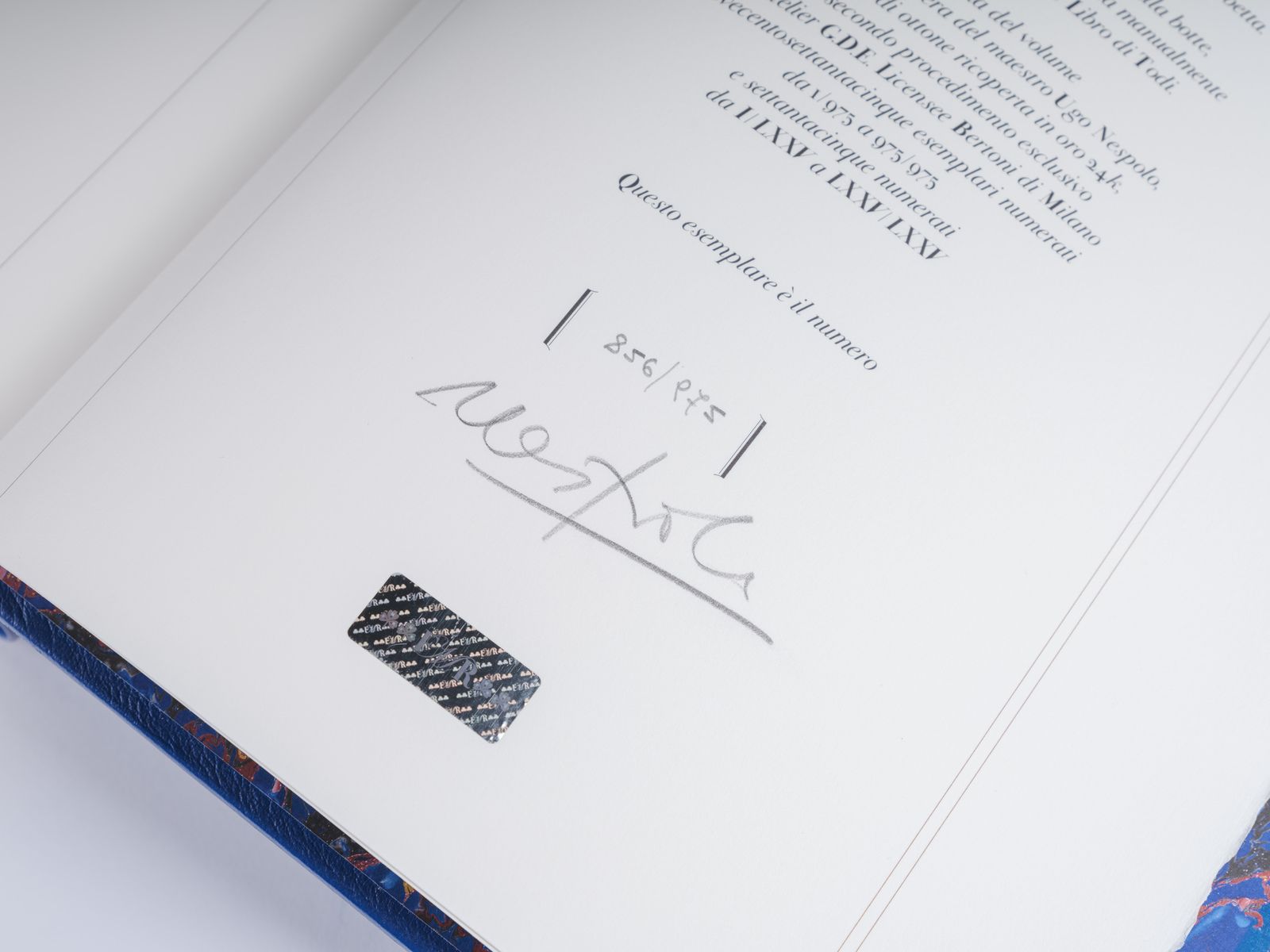 856/975. Tiratura e firma a incisione sulla copertina. Tiratura e firma a matita nel colophon. Edizione totale: 975 + LXXV esemplari. Editore: Art'è s.p.a, Bologna. Stampatore: Stamperia Valdonega di Arbizzano, Verona. Carta Cartiere d'Arches, Francia. Le otto serigrafie fuori testo di Ugo Nespolo sono state stampate presso la Stamperia d'arte L'Incisione, Corbetta. Sulla copertina l'opera di Ugo Nespolo, smalto su lastra di ottone ricorperta in oro 24k, è stata realizzata presso l'Atelier G.D.E. Licensee Bertoni, Milano. La legatura in pelle naturale tinta alla botte è stata realizzata presso la legatoria L'Arte del Libro, Todi. Lievi difetti.