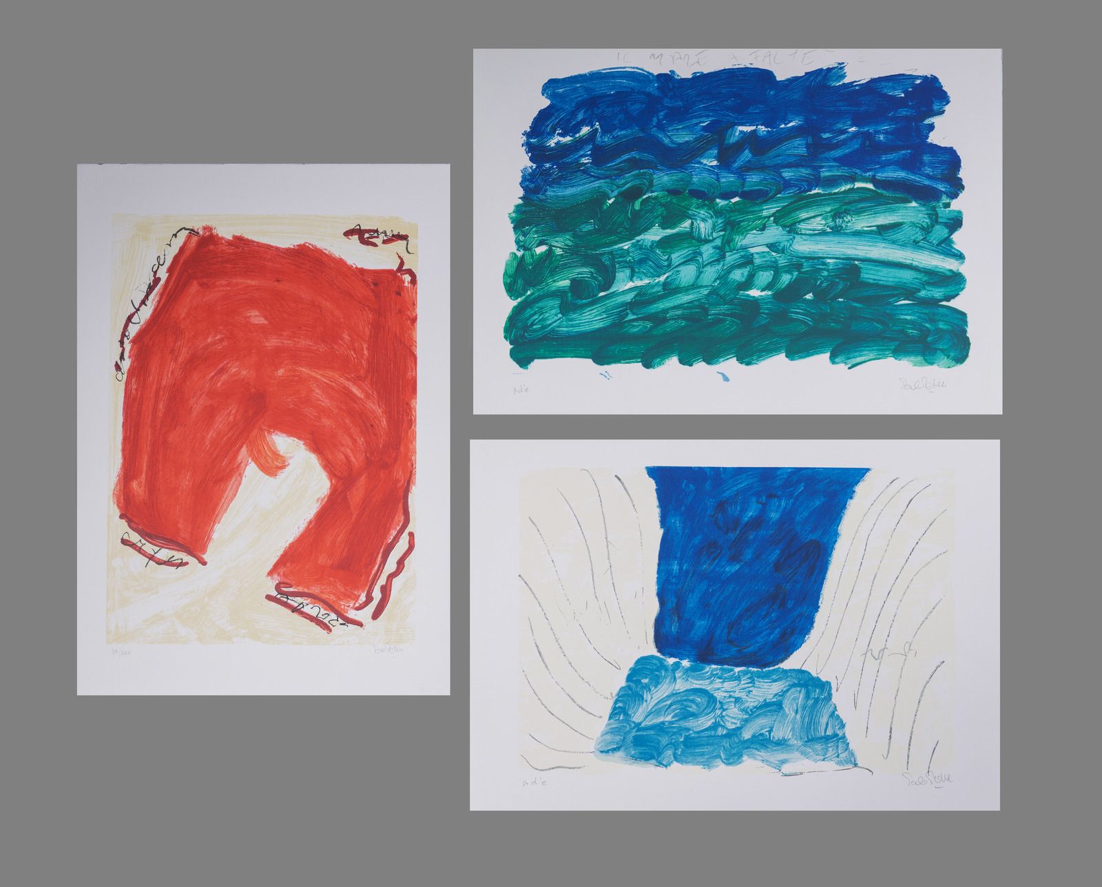 39/100. p.d.a. p.d.a. Tiratura e firma in basso a matita. Dimensioni: 50x70 cm (x2). 70x50 cm. Editore Euromobil Arte, Falzé di Piave (Tv). Carta Fabriano.