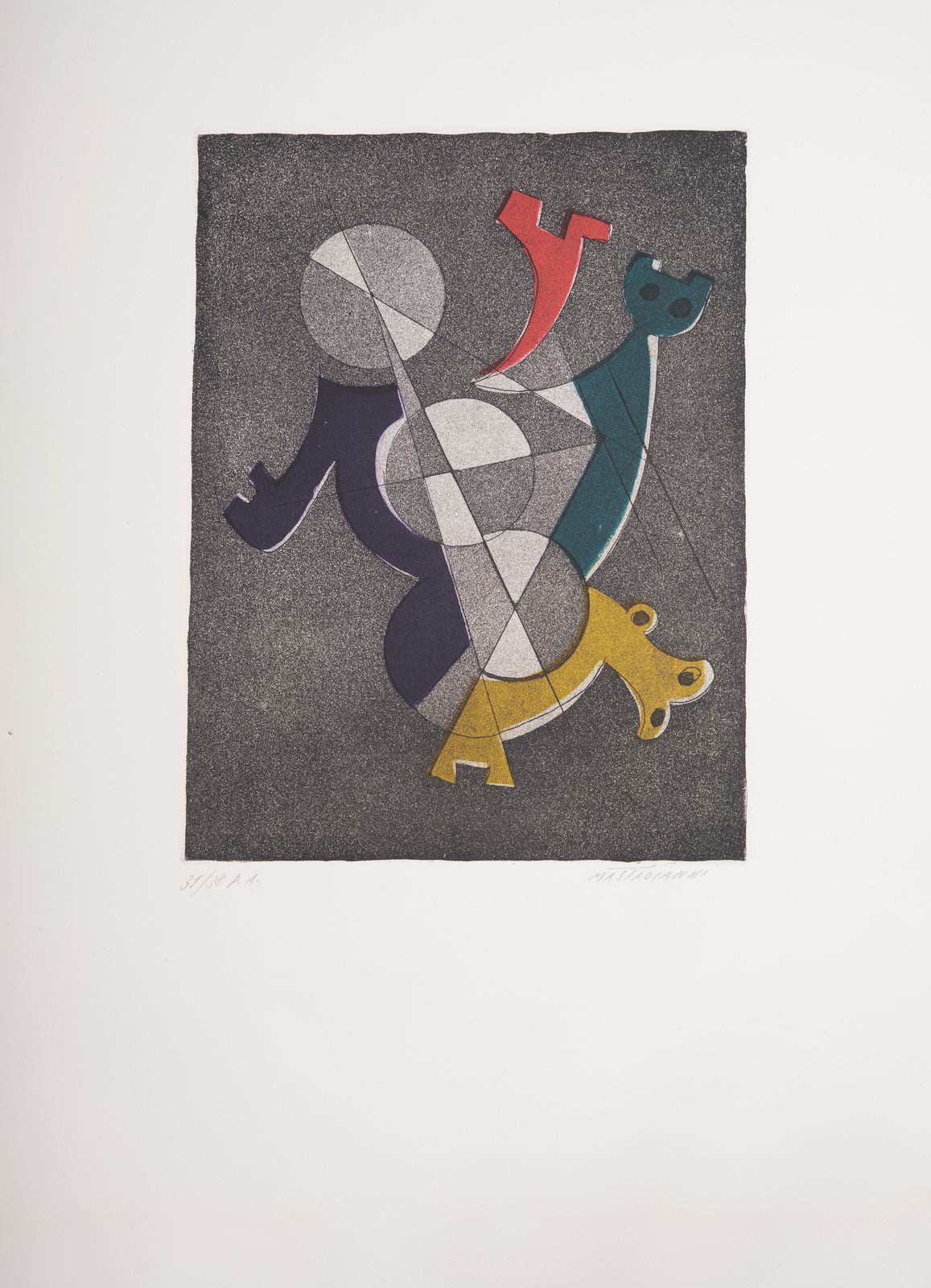 31/38 p.a. Tiratura e firma in basso a matita. Timbro a secco Grafica Romero, Roma, in basso a sinistra. Dimensione lastra: 32x24 cm. Lievi difetti.