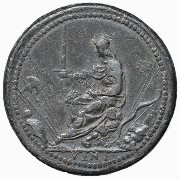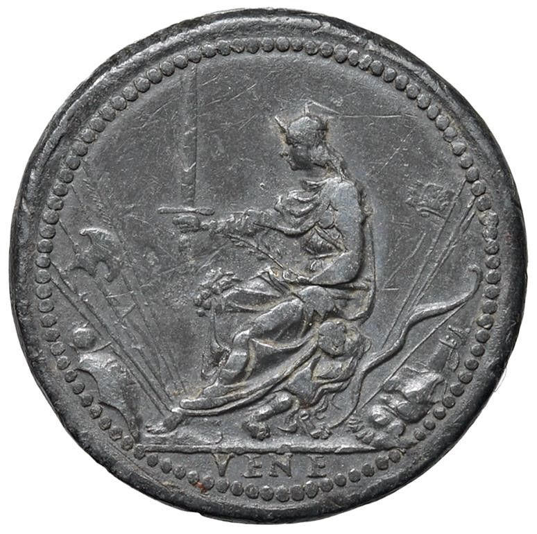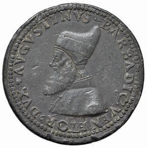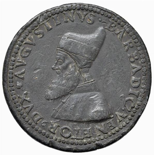 AGOSTINO BARBARIGO (1486-1501) LXXIV DOGE. MEDAGLIA CELEBRATIVA CONIATA A VENEZIA NEL 1486 OPUS VETTORE GAMBELLO DETTO CAMELIO (ATTR.) Pb mm. 31 AVGVSTINVS BARBADIC VENETOR DVX Busto a s. con corno dogale e lunga barba R/ Venezia seduta su un trono, sostenuto da un leone, brandisce una spada. Es. VENE Rif: Armand II, 4; Rizzini II, 494; Volt. 1276 Rarissima. Coniazione coeva. Patina grigio-scuro, SPL Very rare. Coeval coinage. Dark-grey tone, EF