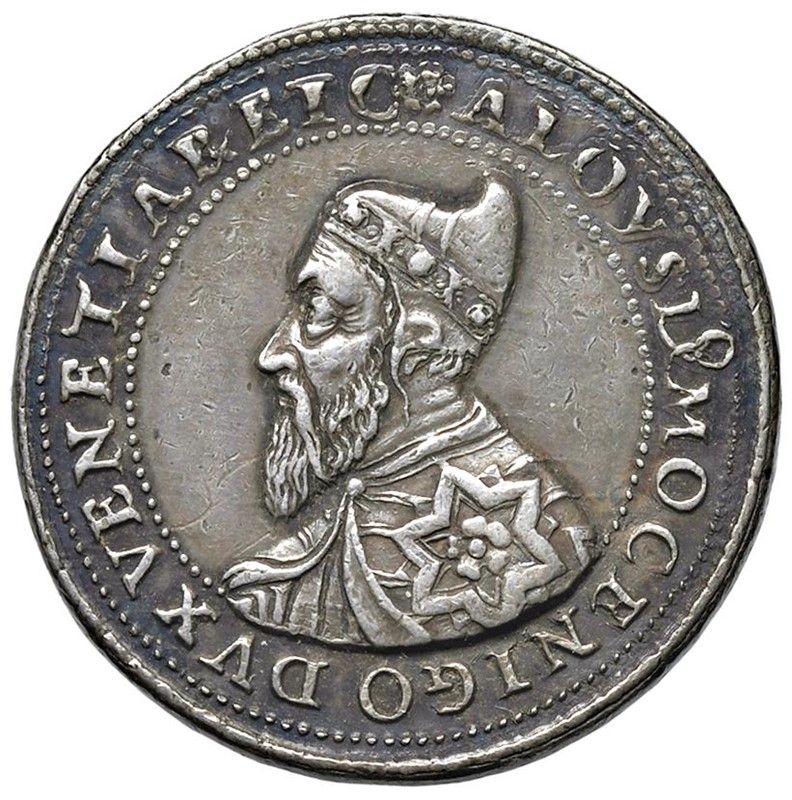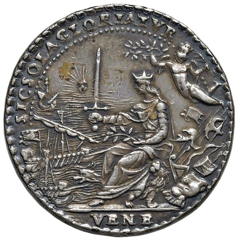 ALVISE I MOCENIGO (1570-1577) LXXXV DOGE. MEDAGLIA CELEBRATIVA CONIATA A VENEZIA NEL 1571 OPUS ANONIMO Ar mm. 32 gr. 26,59 ALOYSI MOCENIGO DVX VENETIAR ET C Busto a s. con corno dogale e lunga barba R/ SIC SOLA GLORIATVR Venezia coronata, seduta a s., brandisce una spada con la d. e un ramoscello d’olivo con la s. mentre un genio alato le pone sul capo un serto di alloro; di fronte la flotta veneziana. Es. VENE Rif: Volt. 562 Rarissima. Coniazione coeva. Patina iridescente, SPL Very rare. Coeval coinage. Iridescent tone, EF