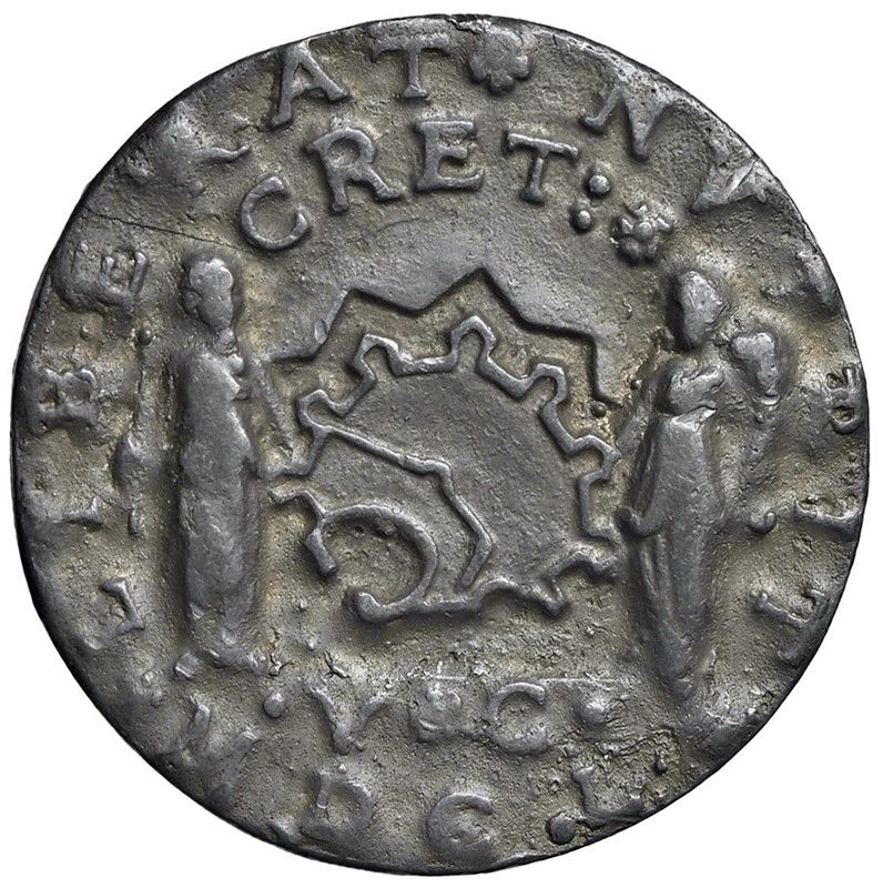 ALVISE LEONARDO MOCENIGO (1583-1654) SUPREMO COMANDANTE A CANDIA CONTRO I TURCHI. MEDAGLIA CELEBRATIVA FUSA A CANDIA NEL 1650 Pb mm. 46 ALOY MOCEN P V D IO IO TRIVMPH Testa a s. in rilievo R/ LIBERAT NVTRIT CRET MDCL V C Pianta della fortezza di Candia Rif: Volt. 945 (riporta solo esemplari in bronzo) Rara. Fusione coeva. SPL Rare. Coeval cast. EF