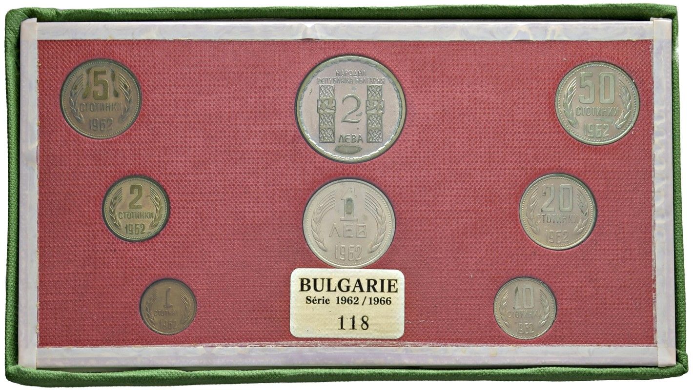 BULGARIA. REPUBBLICA (DAL 1944). ZECCA DI SOFIA. SET COMPLETO DI OTTO MONETE A CORSO LEGALE 1962/1966 (LEVA 2 E 1; 50, 20, 10, 5, 2 E 1 STOTINKI) IN ASTUCCIO ORIGINALE E CERTIFICATO DI EMISSIONE N. 118. LA SERIE È CORREDATA DA SVARIATE BANCONOTE CARTACEE DA 200 A 3 LEVA Ni/Cu FDC MS (8)