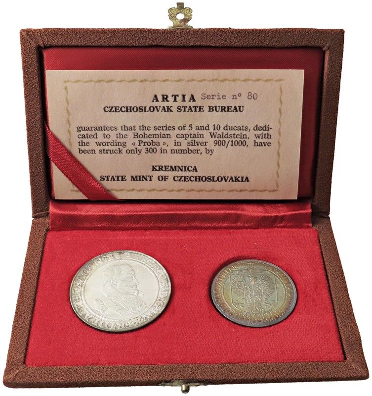 CECOSLOVACCHIA. REPUBBLICA SOCIALISTA (1960-1990). ZECCA DI KREMNITZ. SET DI DUE MONETE IN ARGENTO (10 E 5 DUCATI 1972) DELLA SERIE “WALDSTEIN” IN ASTUCCIO ORIGINALE E CERTIFICATO DI EMISSIONE. SERIE NUMERATA 80 SU UNA TIRATURA DI SOLI 300 ESEMPLARI Ar 900 tot. gr. 45,00 Estremamente rare. Patina iridescente, FS Extremely rare. Iridescent tone, Proof (2)