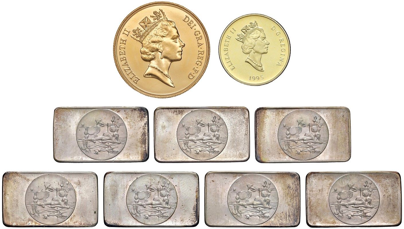 DUE MONETE D’ORO E SETTE LINGOTTINI D’ARGENTO Gran Bretagna, Elisabetta II (1952-2022) 5 Sterline 1986. Mintage 7723 Rara (gr. 39,92); Canada, Elisabetta II (1952-2022) 100 Dollari 1995 con certificato e astuccio della Royal Canadian Monnaie. Mintage 35.0000, n. 178 (gr. 13,45); sette lingottini da 14,07 grammi ciascuno (7) Au tot. gr. 53,37. Ar tot. gr. 98,49 FS Proof (9)