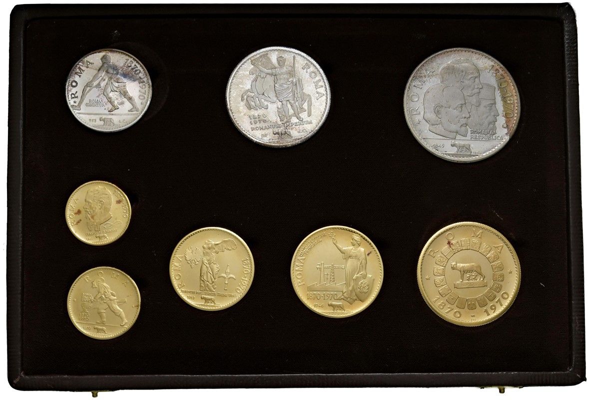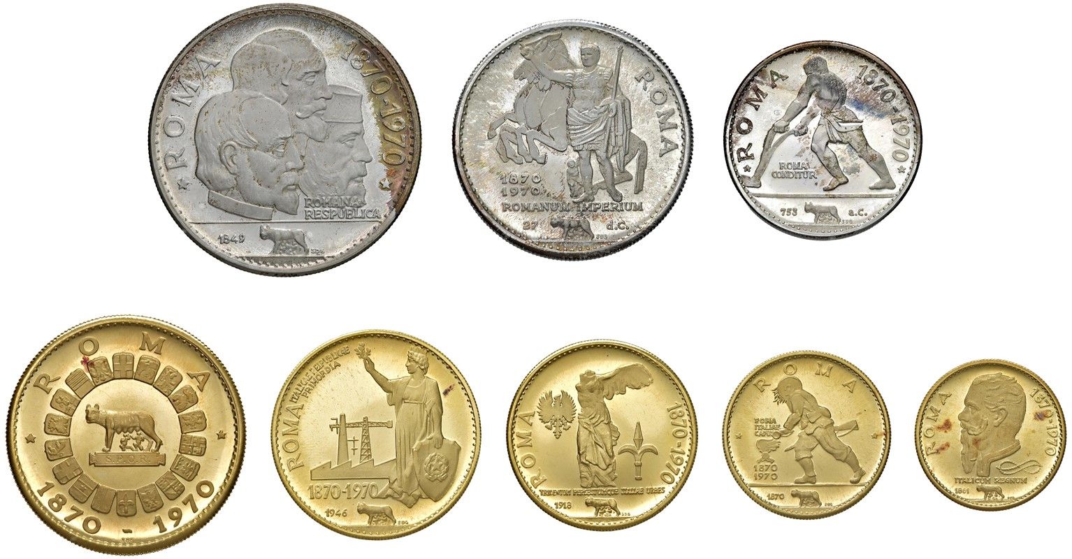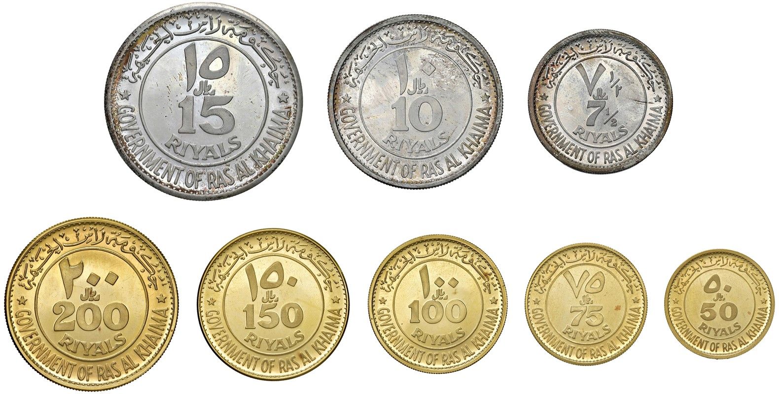 EMIRATI ARABI UNITI RAS-AL-KHAIMAH. SAQR BIN MUHAMMAD AL-QUASIM (1948-2010). SERIE COMPLETA DI OTTO MONETE A CORSO LEGALE (200, 150, 100, 50, 75 RIYALS IN ORO; 15, 10, 7,5 RIYALS IN ARGENTO) PER LA CELEBRAZIONE DEL CENTENARIO DI ROMA CAPITALE (1870-1970) IN ASTUCCIO ORIGINALE E CERTIFICATO DI EMISSIONE Au tot. gr. 119,00 Rara FS Rare Proof (8)