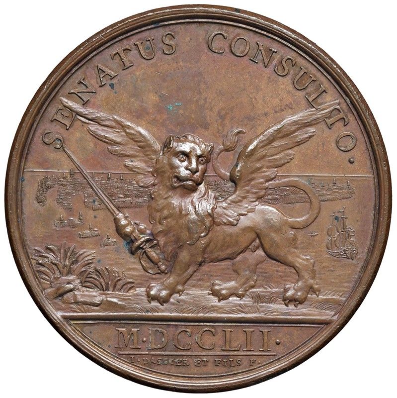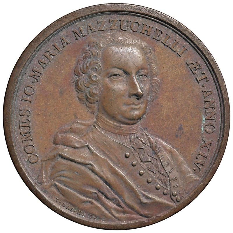 GIANMARIA MAZZUCCHELLI (1707-1765) LETTERATO, COLLEZIONISTA E RICERCATORE BRESCIANO. MEDAGLIA CELEBRATIVA CONIATA A GINEVRA NEL 1752 OPUS JEAN DASSIER E ANTOINE Ae mm. 55 Busto di tre quarti a d. con pizzo, corpetto e mantello R/ Il Leone di San Marco, gradiente a s. e con le ali spiegate regge la spada d’onore. Sullo sfondo, Venezia e la sua laguna con un veliero Rif: Volt. 1523; Forrer I, p. 516; Pialorsi 1990, 56. Rarissima. Coniazione coeva. SPL Rare. Coeval coinage. EF