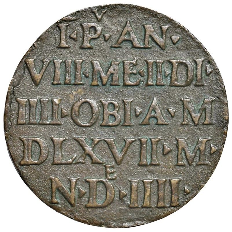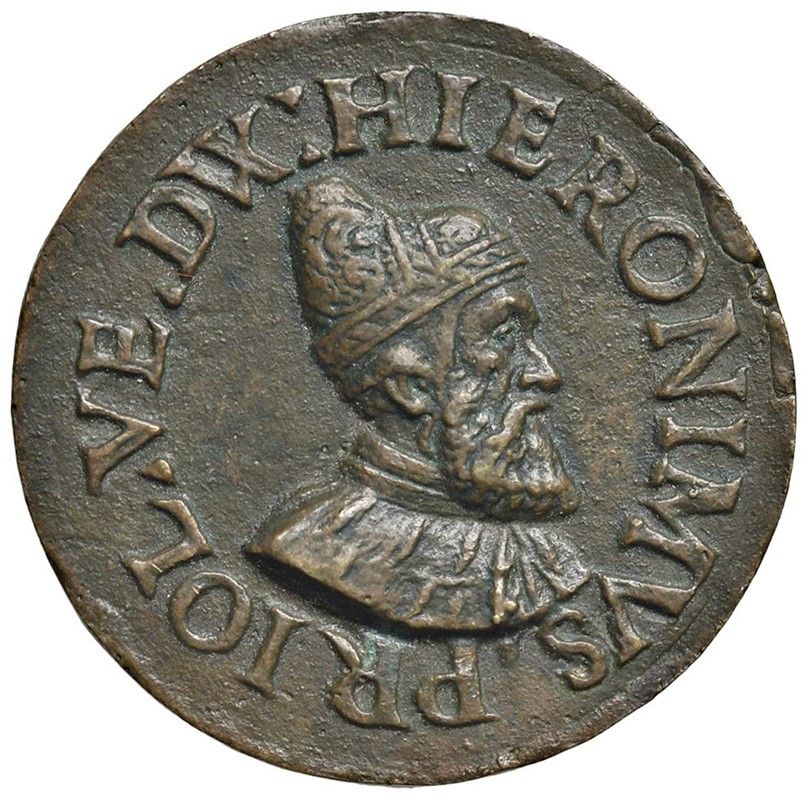 GIROLAMO PRIULI (1559-1567) LXXXII DOGE. MEDAGLIA CELEBRATIVA FUSA A VENEZIA NEL 1567 OPUS ANONIMO Ae mm. 40 HIERONIMVS PRIOL VE DVX Busto a d. con corno dogale R/ I P V AN VIII ME II DI IIII OBI A M DLXVII M N D IIIII Su cinque righe Rif: Volt. 545; Armand II, 4 Rarissima. Fusione coeva con patina marrone scura. SPL Rare. Coeval cast with dark brown patina. EF