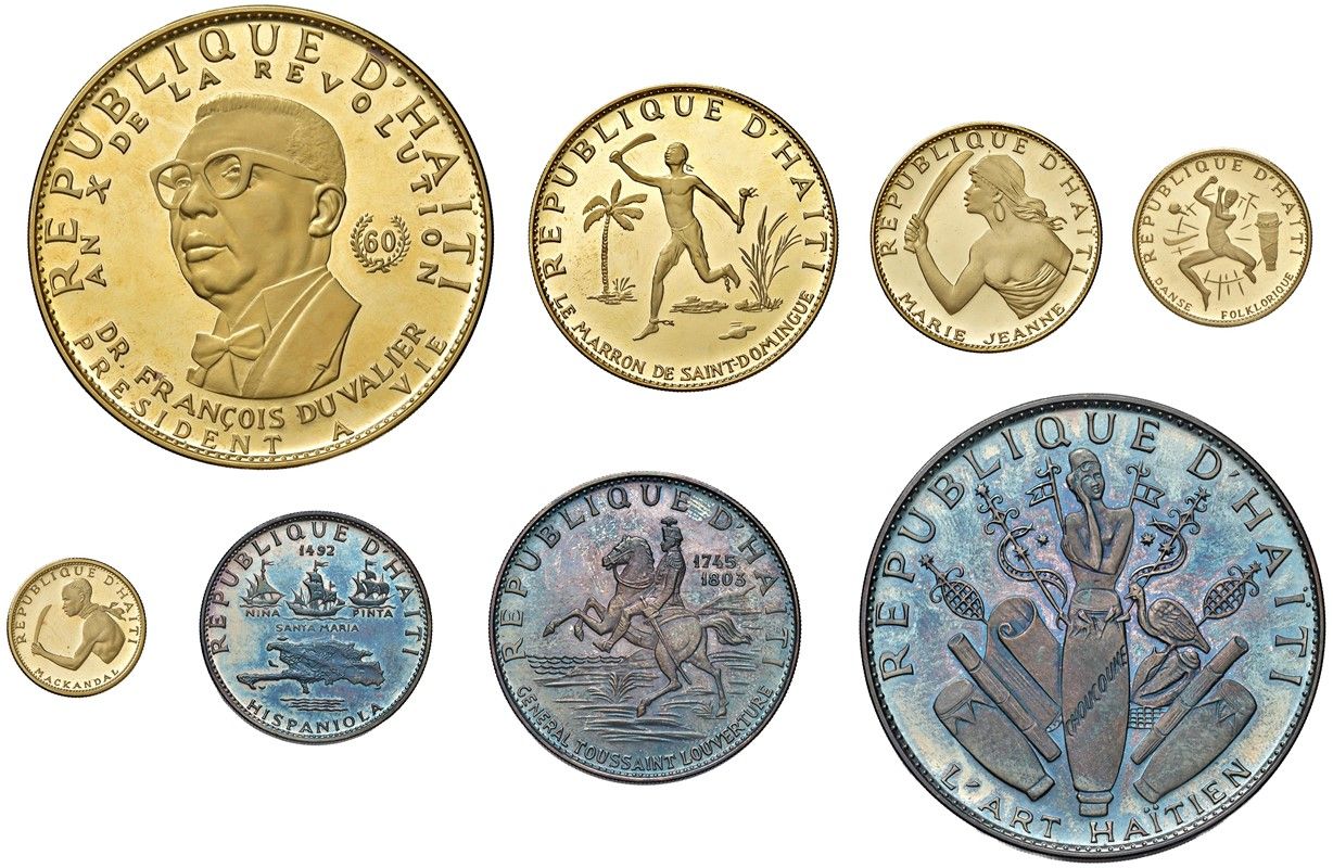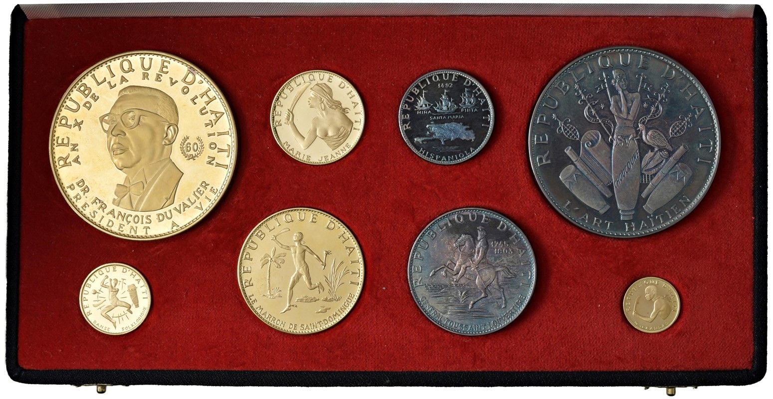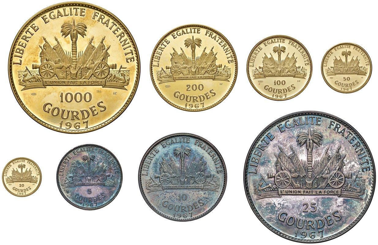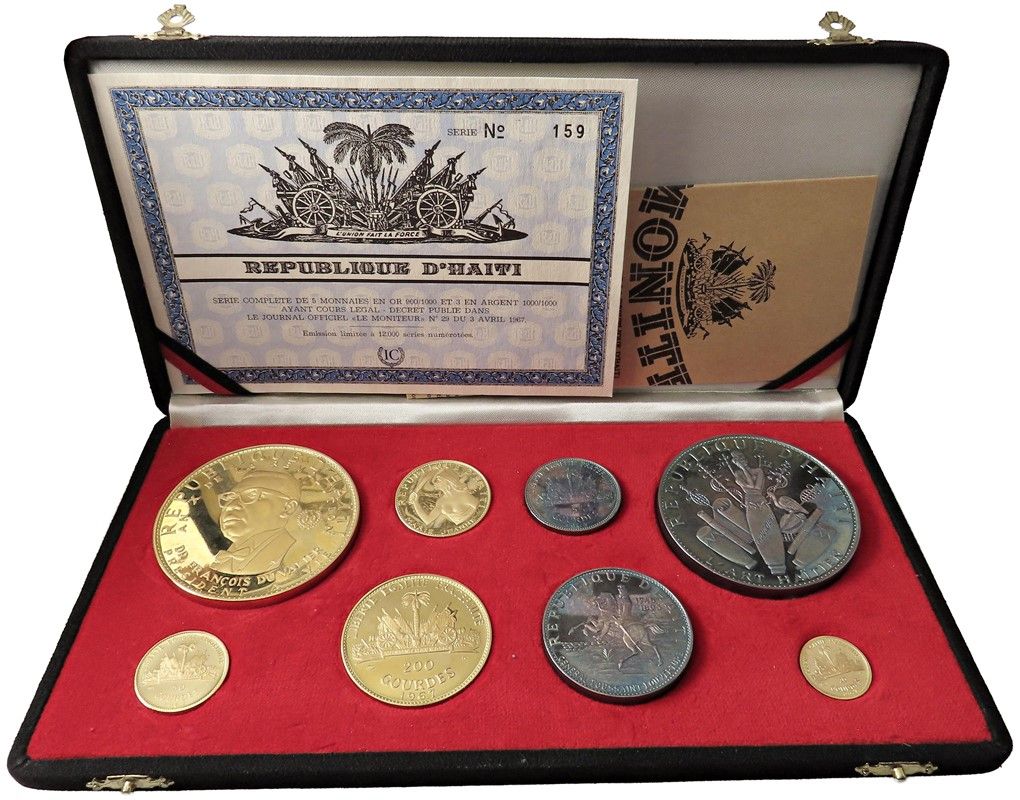 HAITI. REPUBBLICA (DAL 1804). SERIE COMPLETA DI OTTO VALORI (1.000, 200, 100, 50 E 20 GOURDES IN ORO; 25, 10 E 5 IN ARGENTO) 1967 IN ASTUCCIO ORIGINALE E CERTIFICATO DI EMISSIONE N. 159 Au tot. gr. 270,00 Eccezionale, Fs Exceptional, Proof (8)