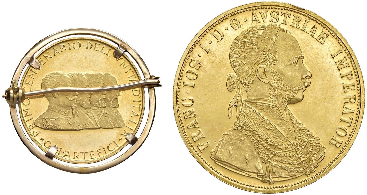 MEDAGLIA IN ORO 900 DEL PRIMO CENTENARIO DELL’UNITÀ D’ITALIA CON MONTATURA A SPILLA IN ORO (GR. 13,39) E RICONIO IN ORO DELLA MONETA DA 4 DUCATI 1915 (GR. 14,00) Au tot. gr. 27,39 SPL/FDC EF/MS (2)