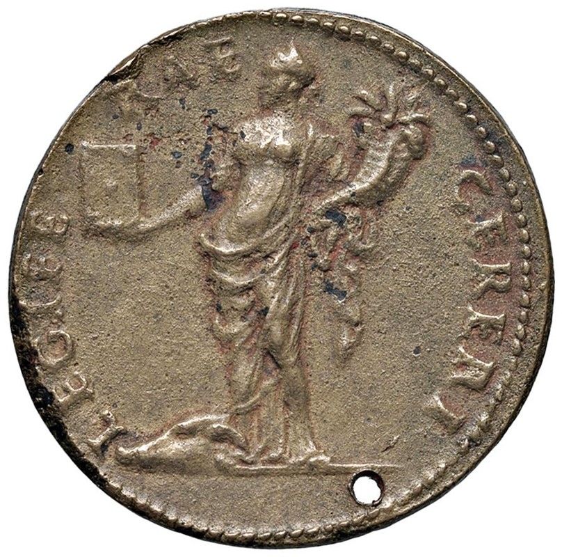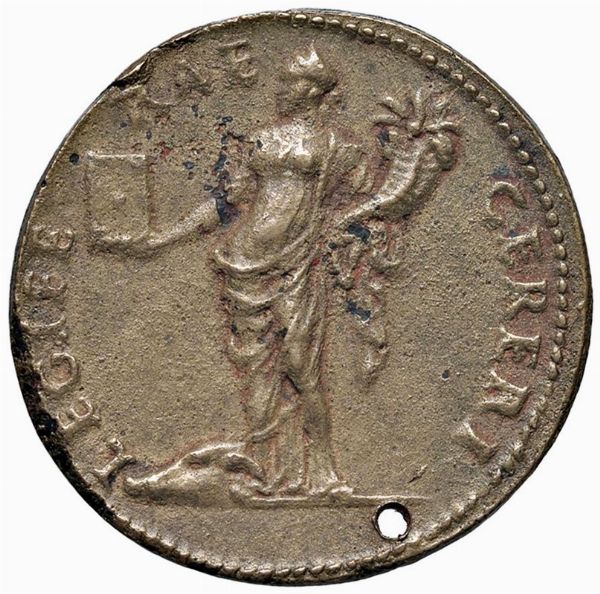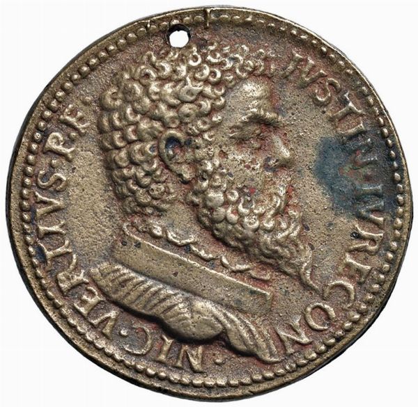 NICOLÒ VERCI (XVI SEC.) GIURESCONSULTO DI CAPODISTRIA. MEDAGLIA CELEBRATIVA CONIATA A PADOVA NEL 1525-1550 OPUS GIOVANNI DA CAVINO Ae mm. 37 NIC VERITVS P F IVSTIN IVRE CON Busto a d. barbuto R/ LEGIFERAE CERERI Figura femminile con cornucopia e libro. Ai piedi testa di cinghiale Rif: Volt. 453; Armand I, 35 Forata. Coniazione coeva con patina bronzo dorato. Rara. BB Holed. Coeval coinage with gilt-bronze patina. Rare. VF