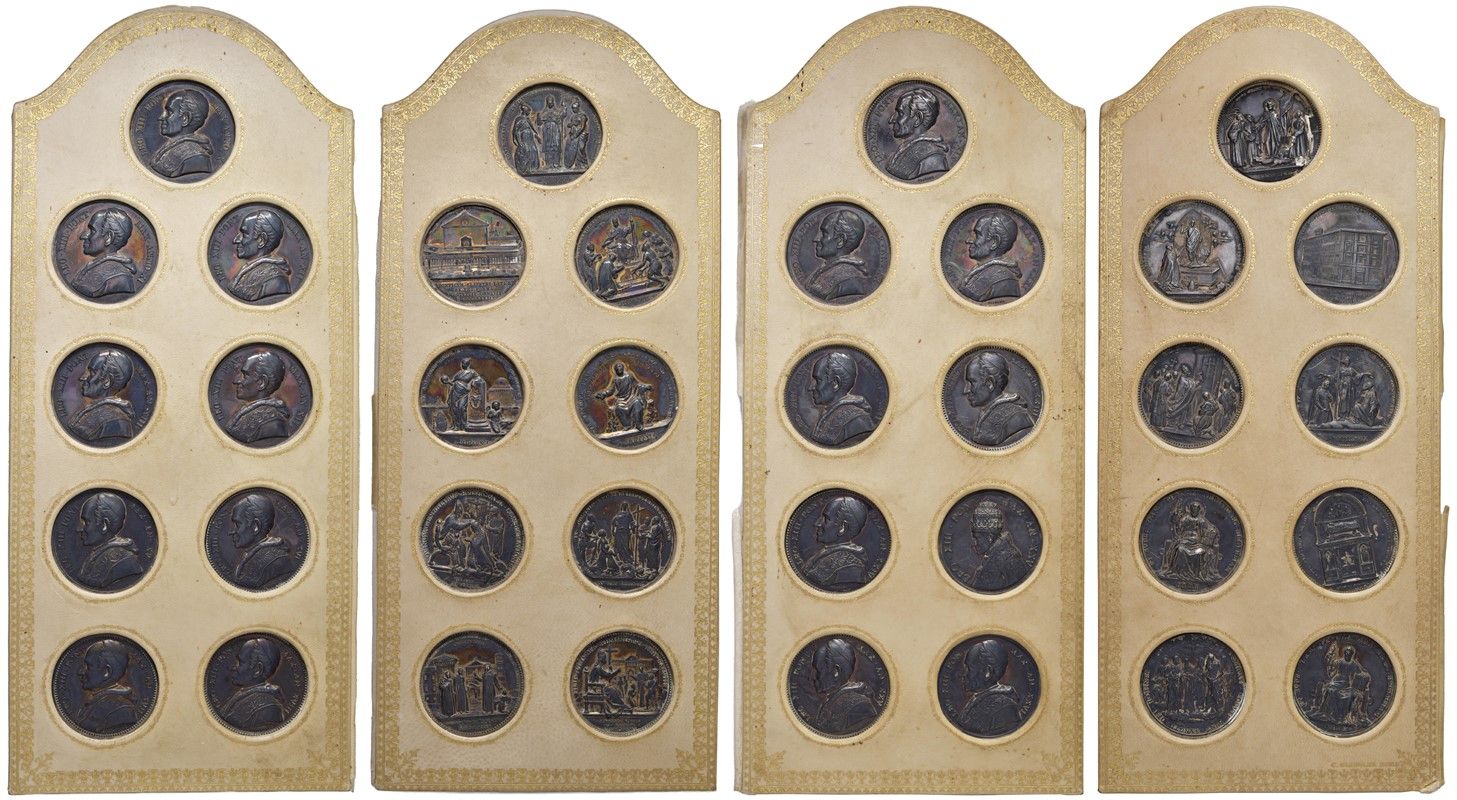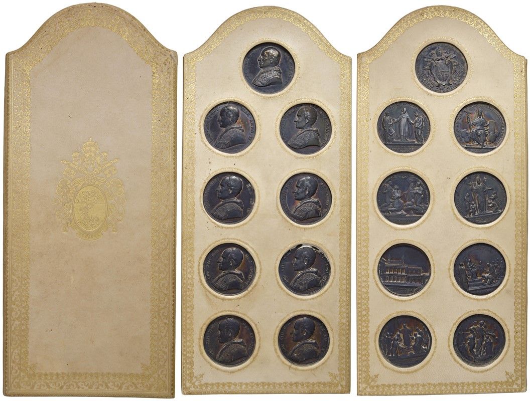 PAPALI. LEONE XIII (1878-1903). IMPORTANTE RACCOLTA COMPLETA DI TUTTE LE VENTISETTE MEDAGLIE IN ARGENTO DELLA VITA DI QUESTO PONTEFICE (DALL’ANNO I ALL’ANNO XXVI) IN CONSERVAZIONE FIOR DI CONIO E CON STRAORDINARIA PATINA IRIDESCENTE RACCHIUSA IN ELEGANTE ESPOSITORE COLOR AVORIO CORREDATO DA FREGI IN ORO E BLASONE DI PAPA PIO X (SUCCESSORE DI LEONE XIII) NEL FRONTESPIZIO Estremamente rara completa di tutti gli anni FDC Extremely rare complete with all years MS (27)
