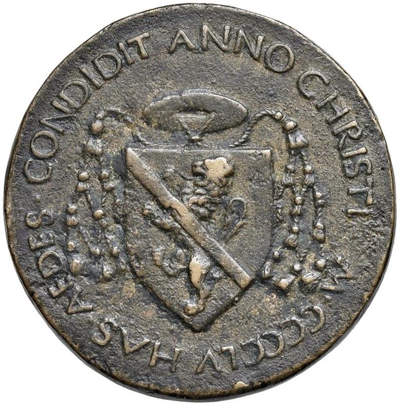 PIETRO BARBO (1418-1471) CARDINALE E PAPA PAOLO II. MEDAGLIA CELEBRATIVA PER LA COSTRUZIONE DI PALAZZO VENEZIA FUSA A ROMA NEL 1455 OPUS ANONIMO DI SCUOLA ROMANA Ae mm. 34 PETRVS BARBVS VENETVS CARDINALIS S MARCI Busto a s. R/ HAS AEDES CONDIDIT ANNO CHRISTI MCCCCLV Stemma sannitico sormontato da galero. Rif: Volt 20; Hill 737; Kress 206 Rara. Mancanza di metallo al bordo, q.SPL Rare. Lack of metal at the edge, a.EF