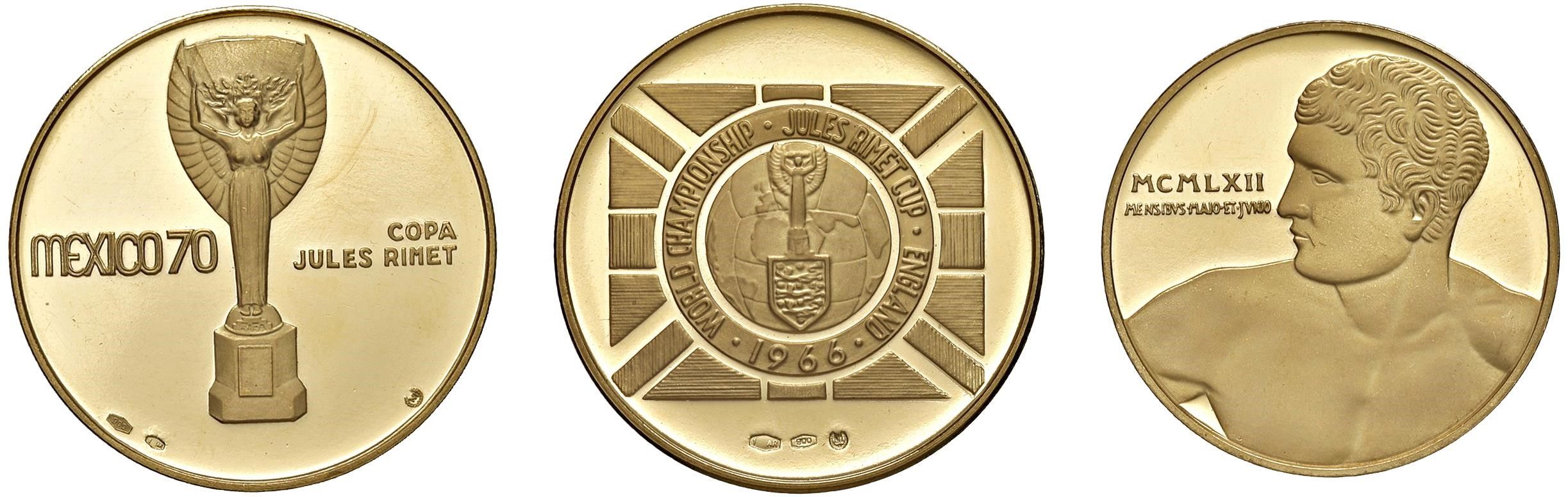 TRE MEDAGLIE IN ORO 900 COMMEMORATIVE DEI CAMPIONATI DI CALCIO DEL 1962, 1966 E 1970