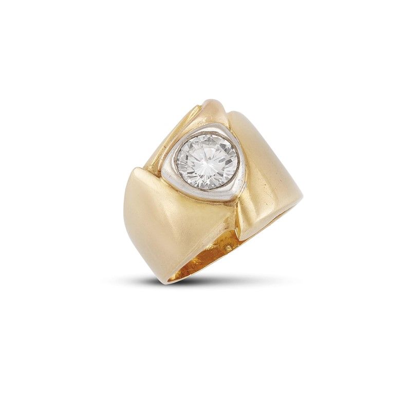 in oro giallo e bianco 18kt, impreziosito da un diamante taglio brillante (smontato) di ct 1.32, punzoni 750 e del fabbricante, mis. 57, gr. 12