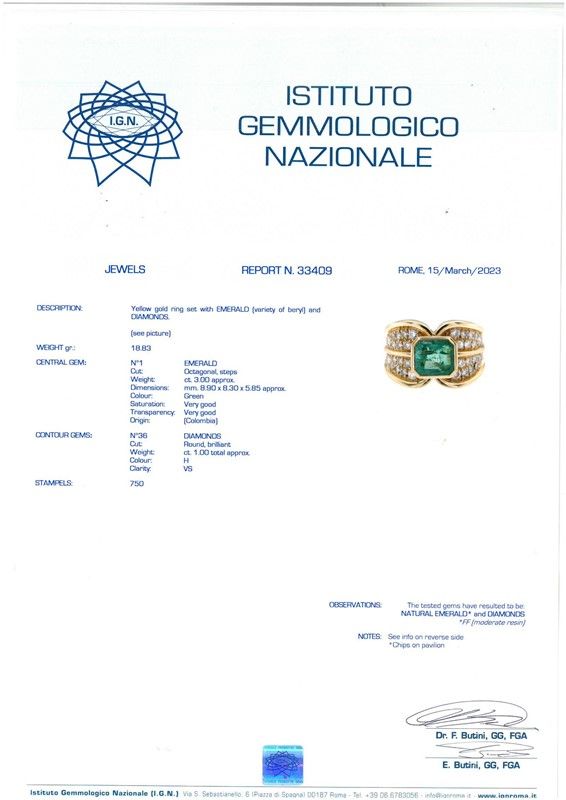 ANELLO A FASCIA CON SMERALDO COLOMBIANO E DIAMANTI in oro giallo 18kt, con al centro uno smeraldo colombiano taglio ottagonale di ct 3 circa, circondato da diamanti taglio brillante per ct 1 circa, colore H, purezza Vs, punzone 750, mis. 46, gr. 18. Corredato di certificato IGN del 15/03/2023 attestante le caratteristiche e l'origine geografica della pietra.