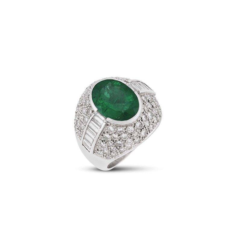 ANELLO A FASCIA CON SMERALDO E DIAMANTI in oro bianco 18kt, impreziosito al centro da uno smeraldo taglio ovale di ct 2.70 circa, affiancato da diamanti taglio baguette per ct 1 circa e circondato da pavé di diamanti taglio brillante per ct 0.70 circa, mis. 53, gr. 13