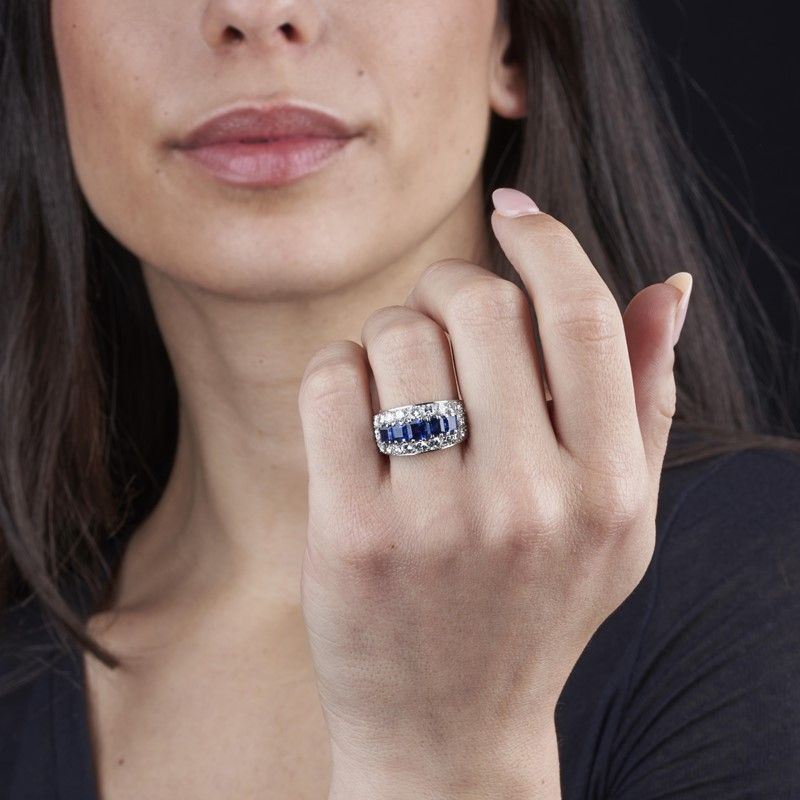 in oro bianco 18kt, impreziosito da cinque zaffiri taglio carré per ct 1.70 circa circondati da pavé di diamanti taglio brillante per ct 2 circa, mis. 56, gr. 11