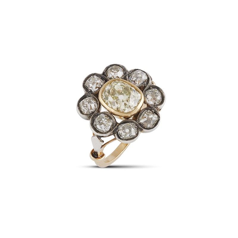 in oro e argento, impreziosito al centro da un diamante taglio antico di ct 1.70 circa circondato da diamanti taglio antico per ct 2 circa, mis. 55, gr. 7