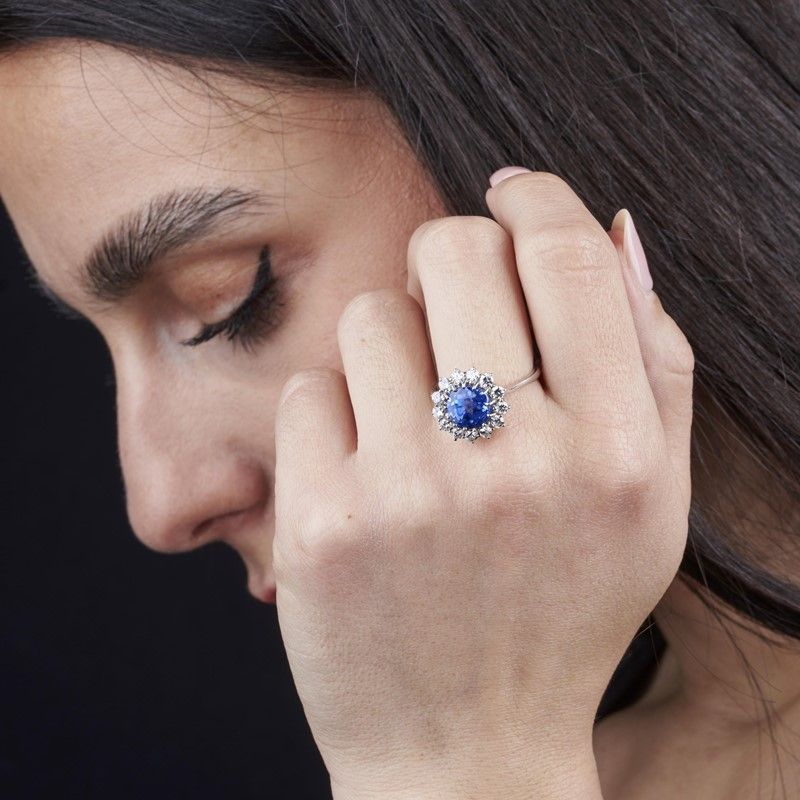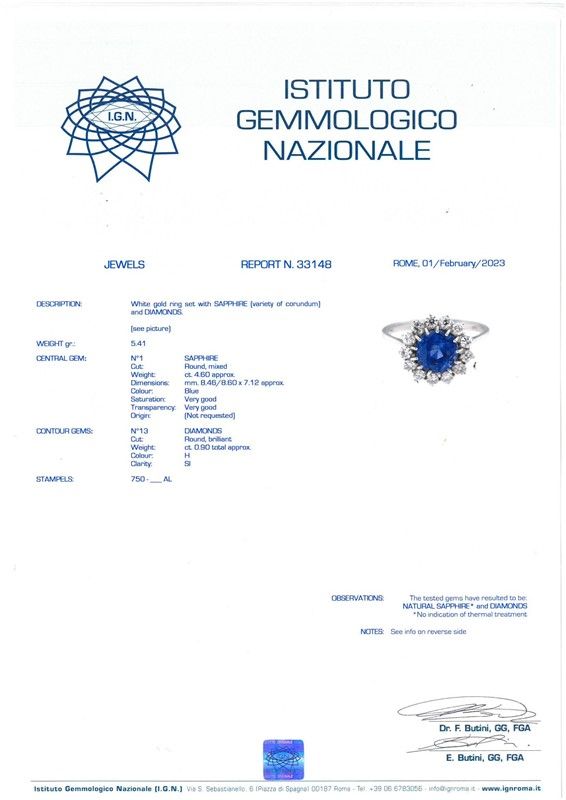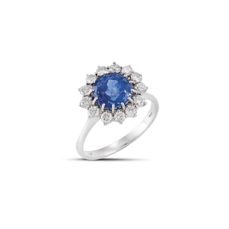 ANELLO A MARGHERITA CON ZAFFIRO E DIAMANTI in oro bianco 18kt, con al centro uno zaffiro taglio rotondo di ct 4.60 circa, circondato da una fila di diamanti taglio brillante per ct 0.90 circa, colore H, purezza SI, punzoni 750 e del fabbricante, mis. 59, gr. 5. Corredato di certificato IGN del 01/02/2023 attestante le caratteristiche e l'assenza di trattamenti termici.