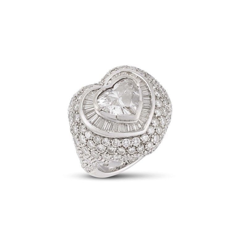ANELLO AD AMPIA FASCIA CON DIAMANTI in oro bianco 18kt, impreziosito da pavé di diamanti taglio brillante per ct 4 circa, con al centro un diamante taglio a cuore di ct 2 circa circondato da una fila di diamanti taglio baguette per ct 1.20 circa, punzone 750, mis. 53, gr. 19