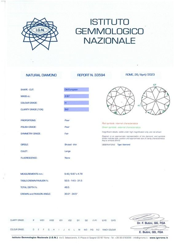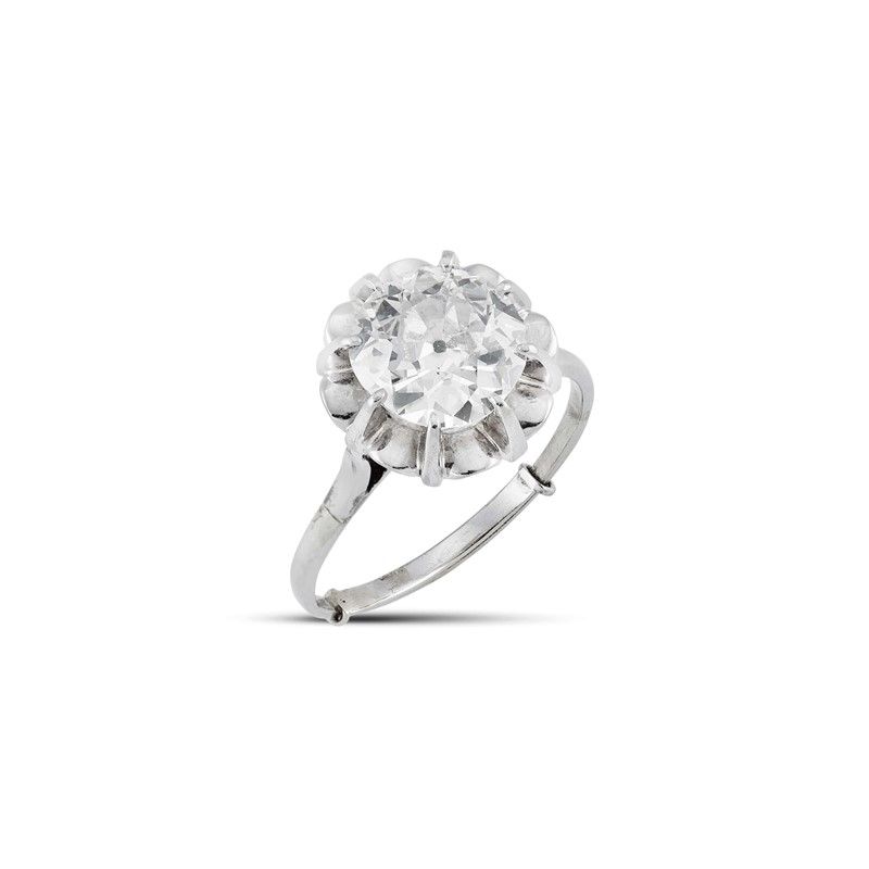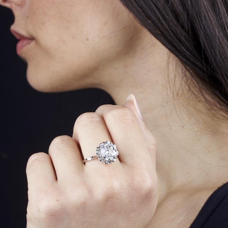 in oro bianco 18kt, realizzato a forma di fiore con al centro un diamante taglio vecchio di ct 2.87, colore H, purezza SI2, mis. 59, gr. 4. Corredato di certificato IGN del 26/04/2023 attestante le caratteristiche.
