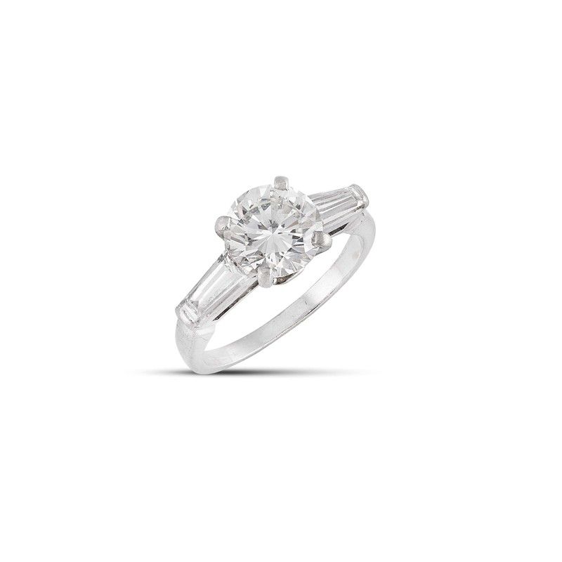 in platino, impreziosito al centro da un diamante taglio brillante di ct 1.40 circa, affiancato da due diamanti taglio tapes per ct 0.40 circa, mis. 48, gr. 4